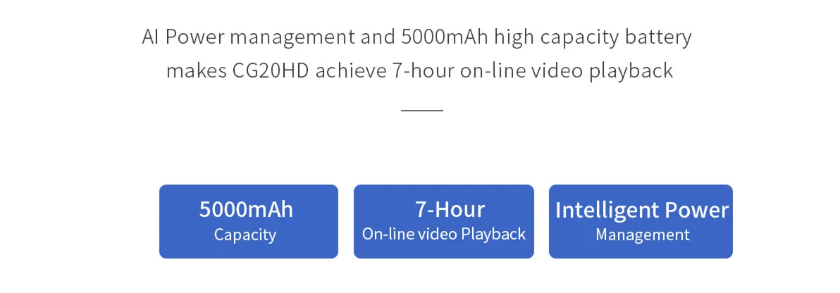 Управление питанием AI и аккумулятор большой емкости 5000 мАч позволяют CG20HD достичь 7-часового онлайн-воспроизведения видео.