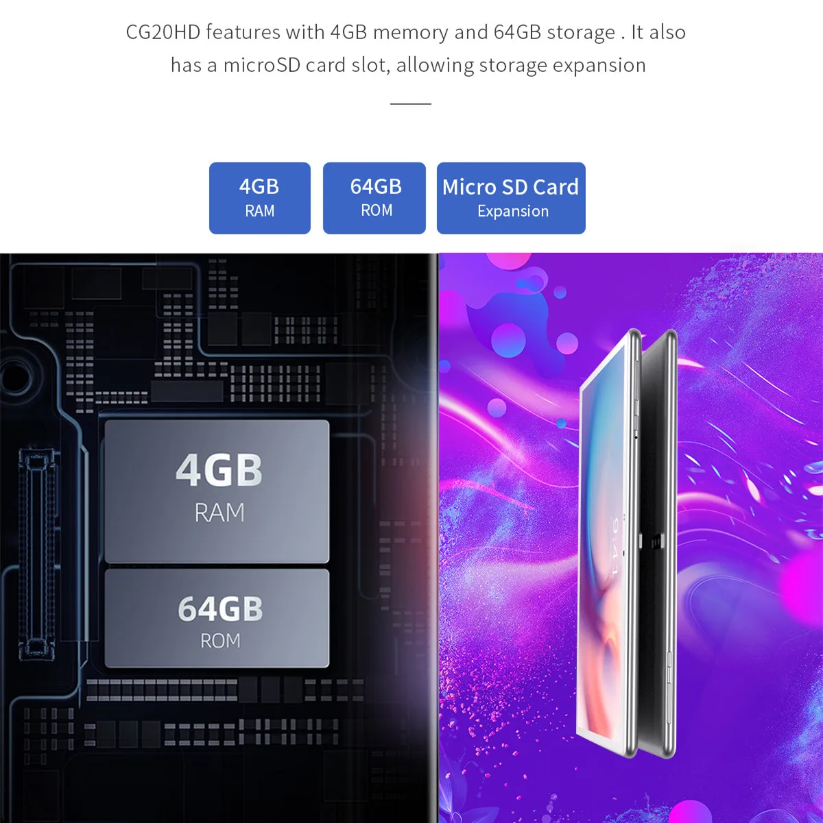 Функция CG20HD с памятью 4 Гб и памятью 64 Гб. Он также имеет слот для карты microSD, что позволяет расширить память.