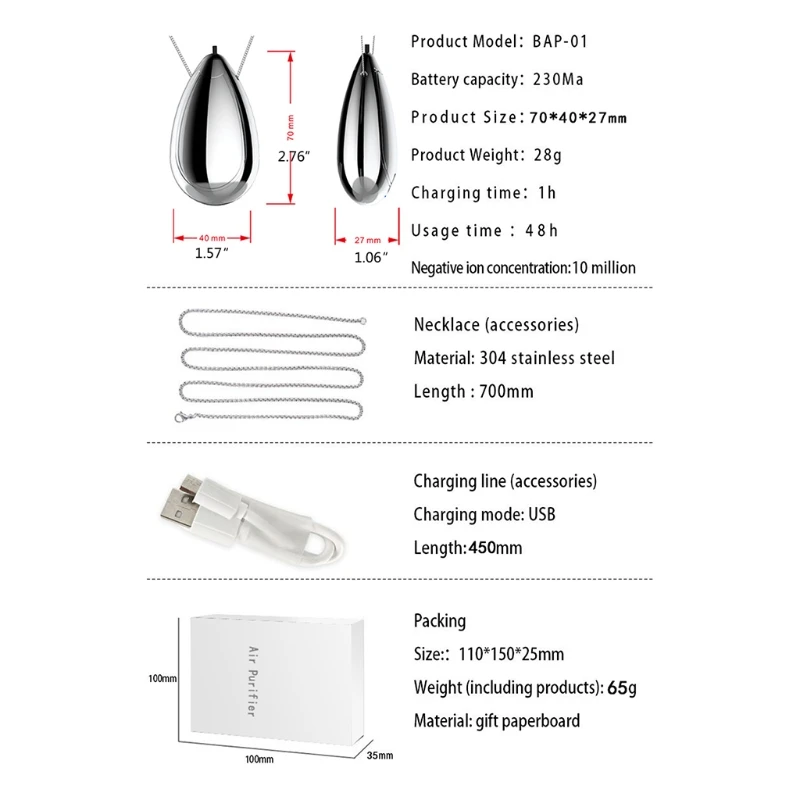 Портативный очиститель воздуха для шеи от формальдегида дезодорирующий мини-освежитель с отрицательными ионами для занятий спортом на открытом воздухе с низким уровнем шума.OOTDTYОсобенности на 100% абсолютно новый и высокого качестваУбивает микробы, удаляет дым и пыль, нулевые расходные материалы, удаляет формальдегид и не шумит. Активно рассеивать PM2.5, дым, пыльцу, пыль, бактерии и другие твердые загрязнители в зоне дыхания. Быстро удаляет дым, эффект очевиден.Легкий корпус, удобно носить, без веса.Интеллектуальный авиационный чип гарантирует, что микроочиститель стабильно выделяет отрицательные ионы кислорода, и цикл очищает и дышит свободно.Ультра-тихий дизайн, мощная очистка, тихий и свежий. Нет расходных материалов, больше не беспокойтесь, попрощайтесь с проблемами традиционной регулярной замены и обслуживания.Модный и изысканный внешний вид, десять миллионов отрицательных ионов. Встроенный аккумулятор большой емкости USB легкий Срок службы батареи, шейный платок из нержавеющей стали.Спецификация: Материал: АБС-пластикРазмер: Approx.4x7x2.7cm/1.57x2.76x1.06inchesДлина ожерелья: 70 см/27,55 дюймаЦвет: черный/серебристый/белыйПосылка включает в себя: 1 очиститель воздухаПримечание: 1. Допускается погрешность в 1-2 см из-за ручного измерения, убедитесь, что вы не возражаете перед заказом.2. В связи с разной конфигурацией разных мониторов изображение не отображает фактический цвет товара.