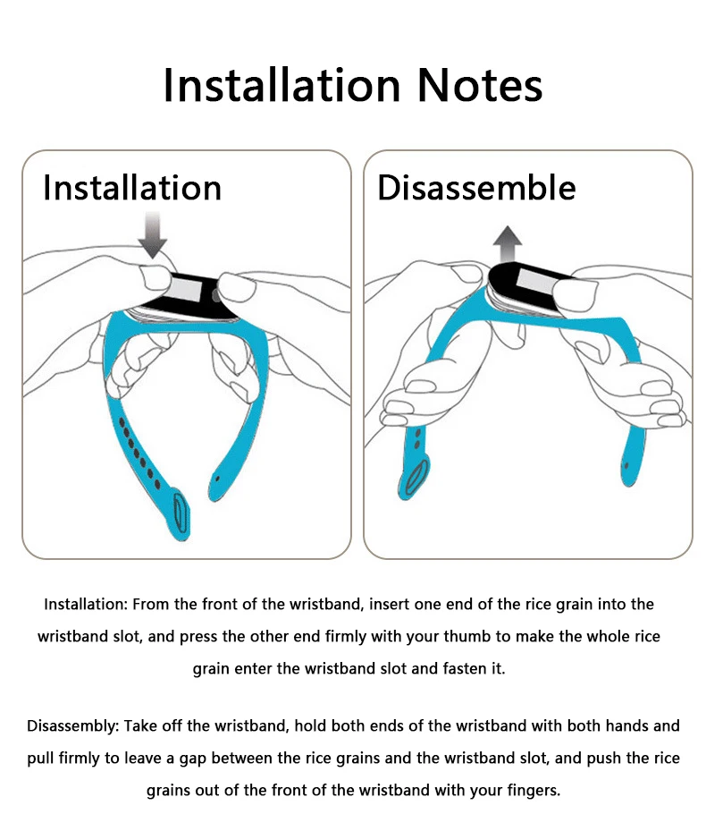 Установка: с передней стороны браслета вставьте один конец рисового зерна в слот для браслета, И плотно прижмите большой палец к другому концу, чтобы зерно риса вошло в слот браслета и закрепило его.Разборка: снимите браслет, удерживайте оба конца браслета обеими руками и плотно Потяните, чтобы оставить зазор между рисовыми зернами и прорезью для браслета, И вытащите рисовые зерна из передней части браслета пальцами.