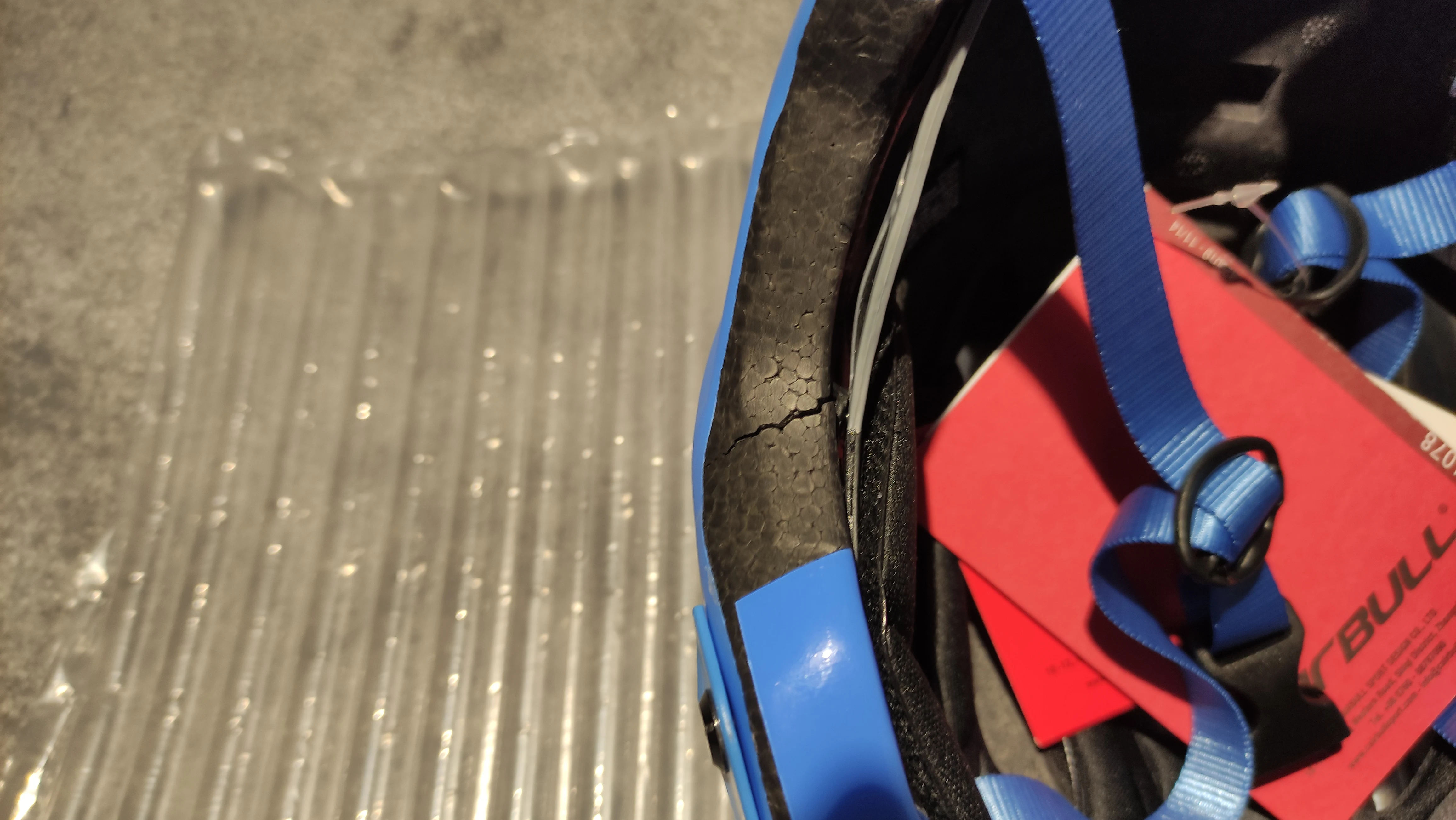 Получил шлем с двумя трещинами в пенополистироле: один маленький и один средний трещины. В данный момент мне не везло с шлемами от двух или трех разных продавцов; Все они прибыли с некоторым количеством повреждений. В следующий раз, я думаю, что буду просто переплатить в местном магазине.