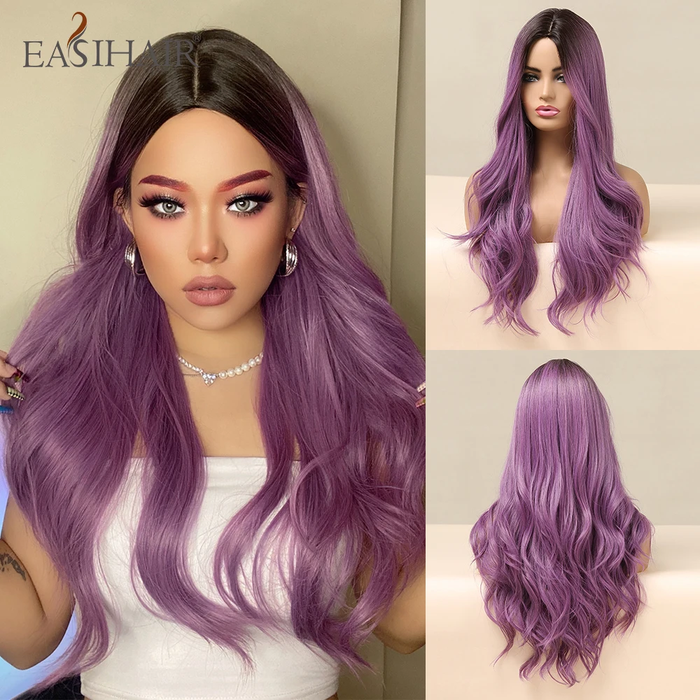 EASIHAIR длинные волнистые Ombre черный фиолетовый синтетические парики для женщин термостойкие натуральные средняя часть Косплей партии Лолита волосы парики