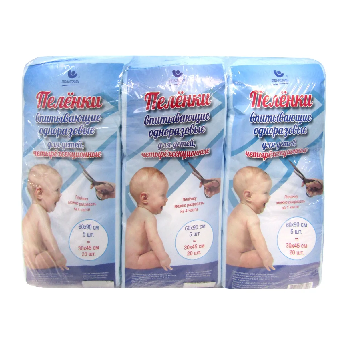 Пеленки одноразовые впитывающие Пелигрин четырехсекционные 60х90 см. (3 уп.х 5 шт.)