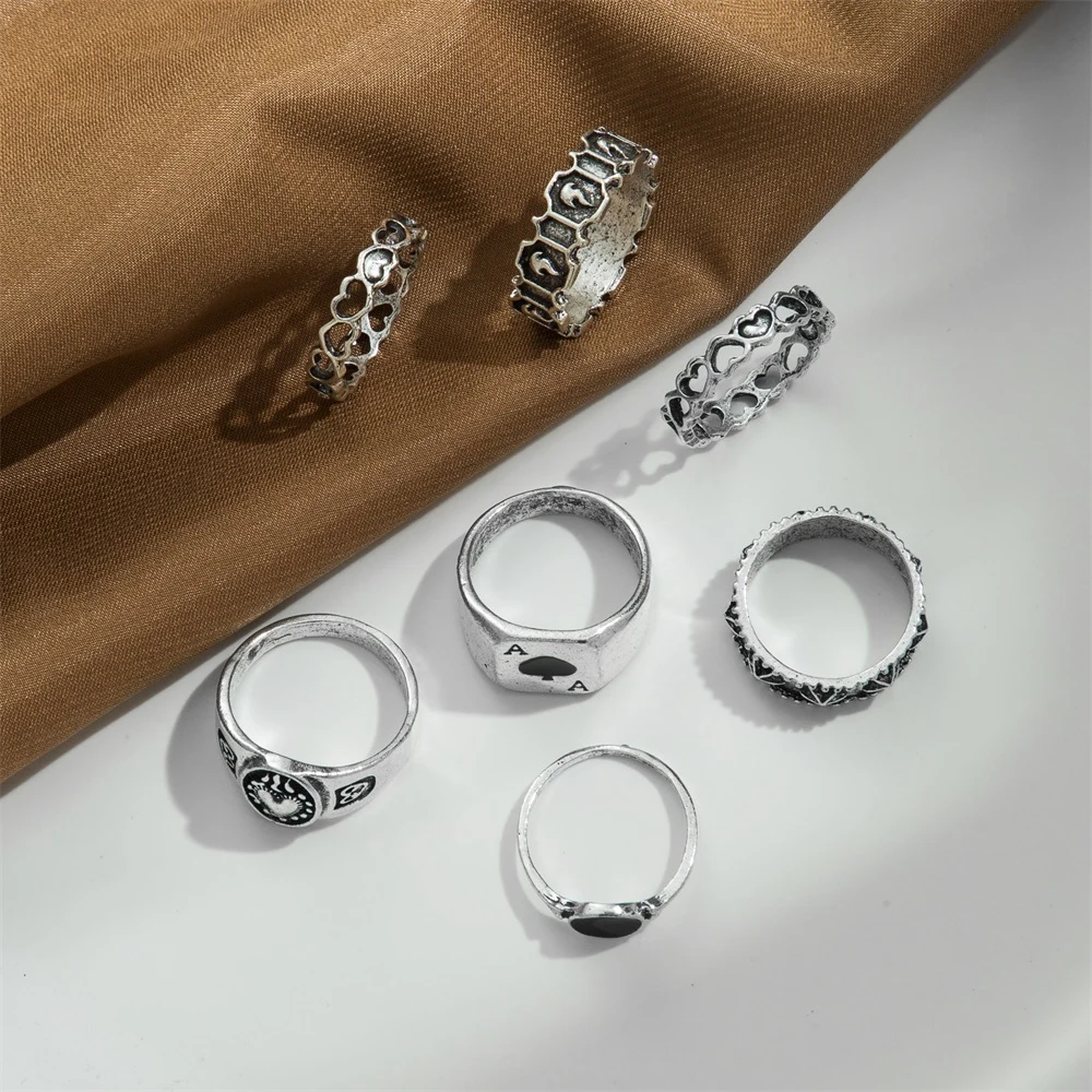 FAMSHIN модное кольцо в виде сердца из 6 шт. Компл. Для женщин и мужчин, черные кости, пики, туз, винтажное очаровательное кольцо на палец, набор подарков, ювелирных изделий