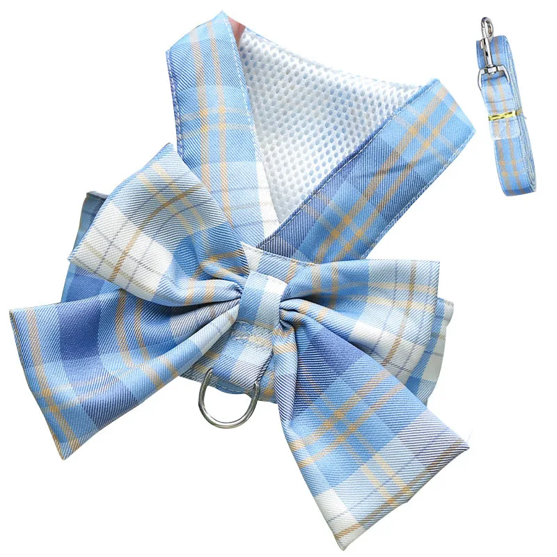 Комплект из шлейки и поводка для собак с большим бантом, клетчатый жилет в стиле французского бульдога, одежда для маленьких собак, аксессуары для питбуля, чихуахуа