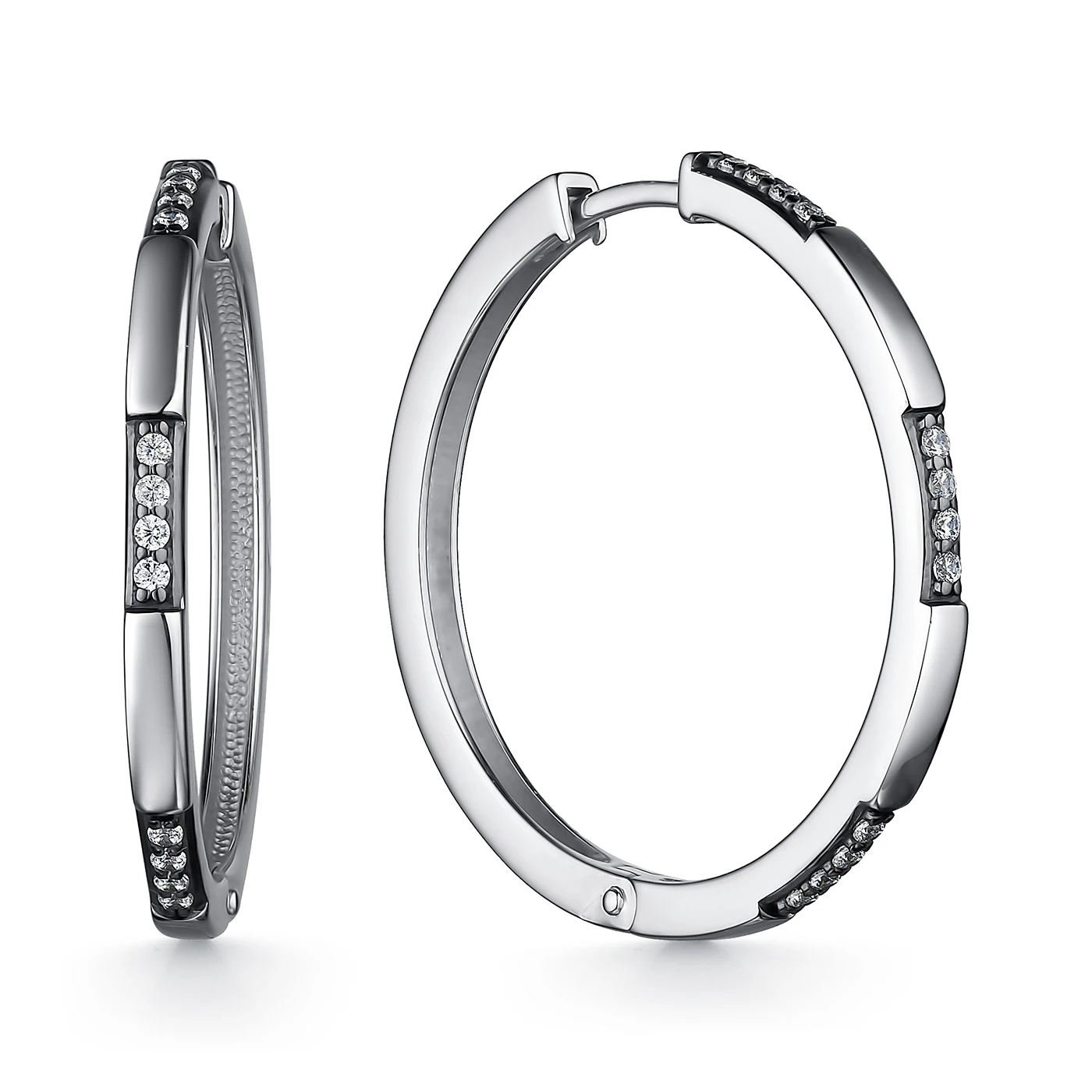 Серьги конго из родированного серебра c кристаллами АЛЬКОР. Бесплатная доставка с ювелирной фабрики в России. Мы покрываем серебро гипоаллергенным слоем родия толщиной 0,4 мкм, чтобы драгоценный металл получил благородный платиновый блеск и не потемнел со временем. Высота изделия: 28,4 мм. Ширина изделия: 2,2 мм.