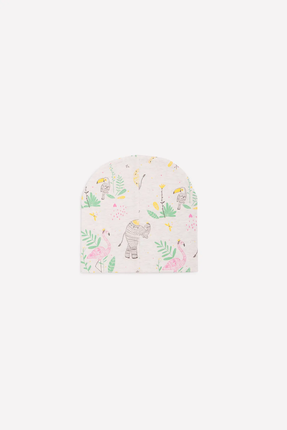 Описание: Бежевая шапочка с изображением слонов и тропическим принтом. Выполнена из трикотажа с эластаном.
