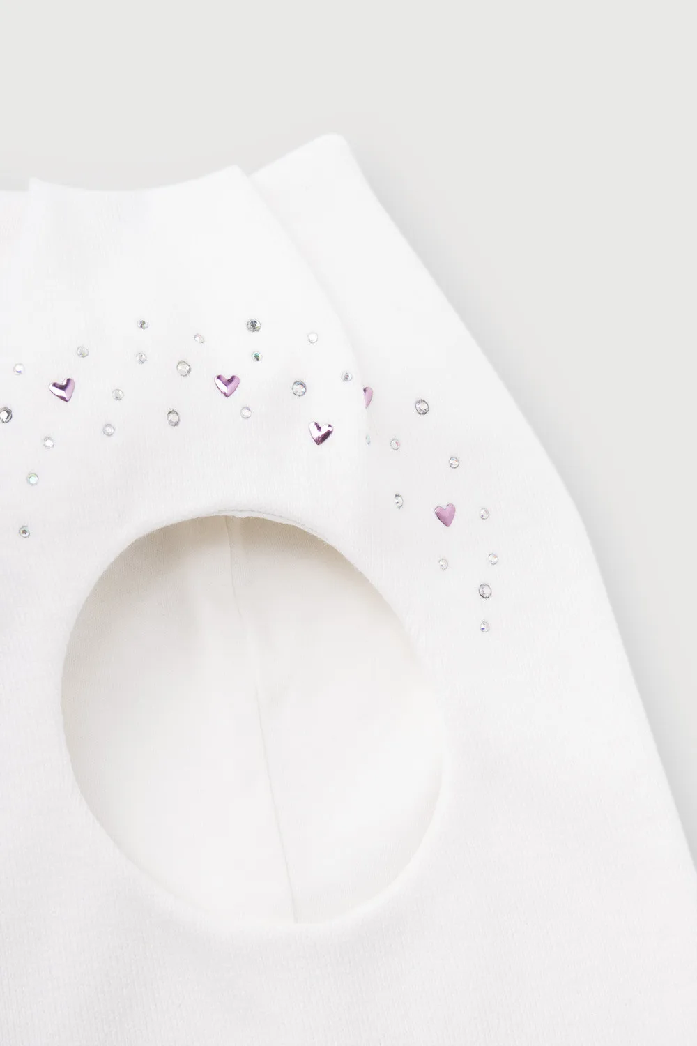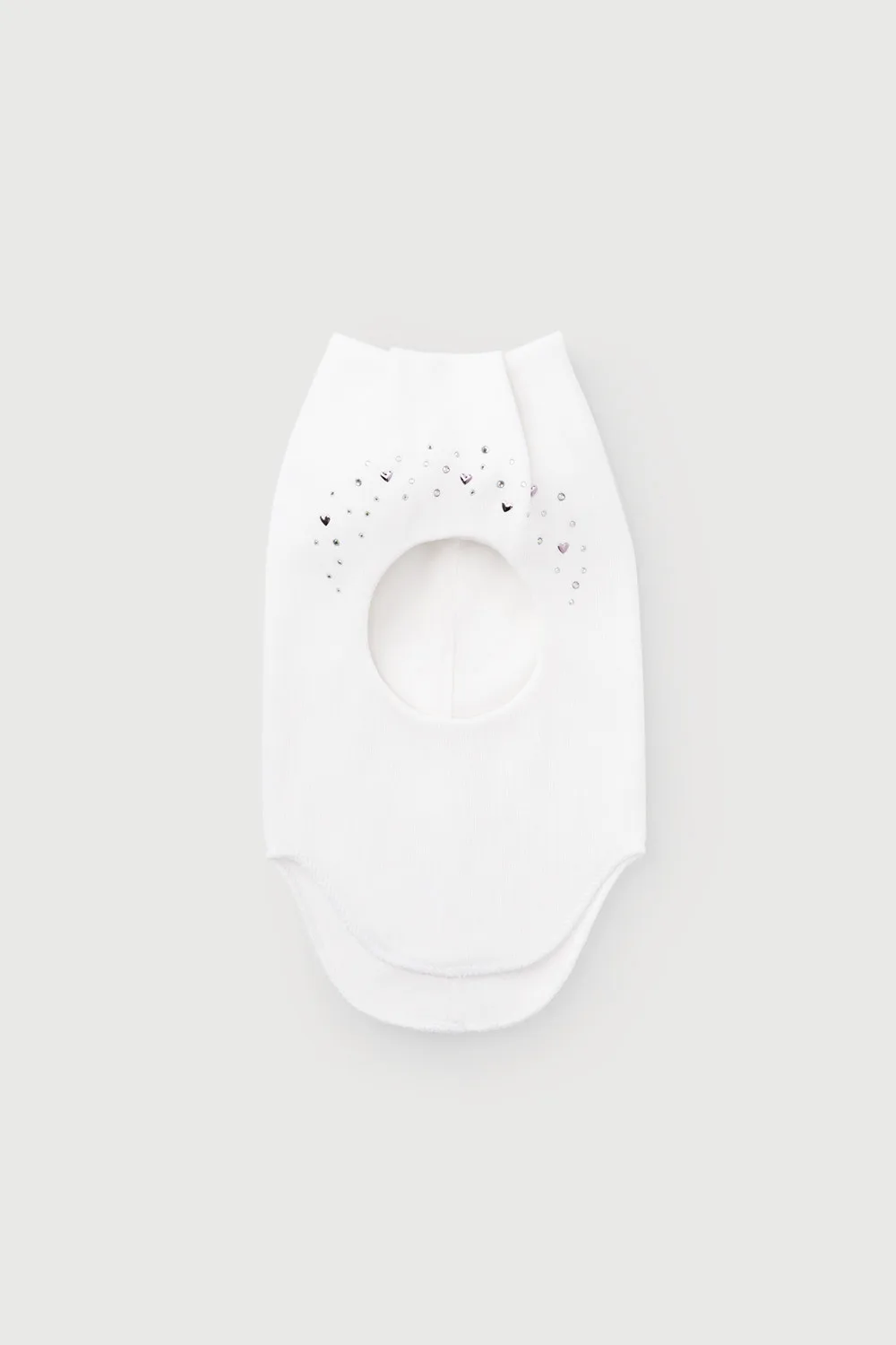 Описание: Шапка-шлем для девочки молочного оттенка с мягкой подкладкой из интерлока. Украшена стразами. На голове - симпатичные кошачьи ушки.