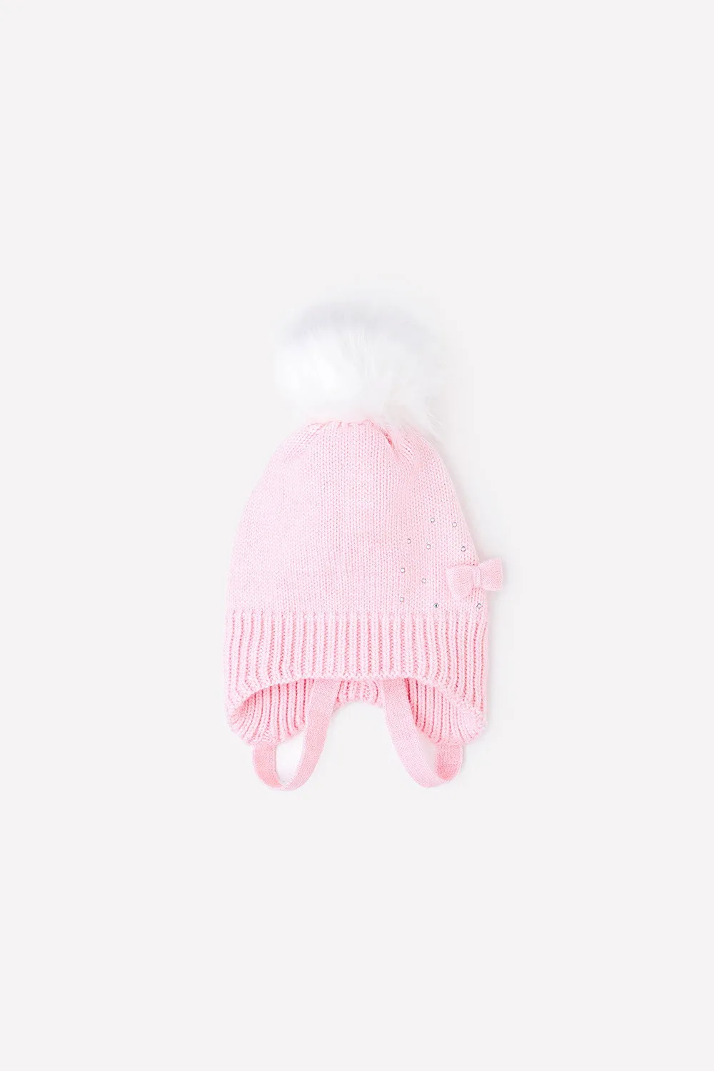 Описание: Однотонная шапка для девочки из полушерстяной пряжи. Подкладка из хлопкового трикотажа интерлок. На макушке помпон из искусственного меха. По нижнему краю эластичная вязка, цельнокроеные уши с широкими завязками. Спереди декоративный бантик, рисунок из страз.