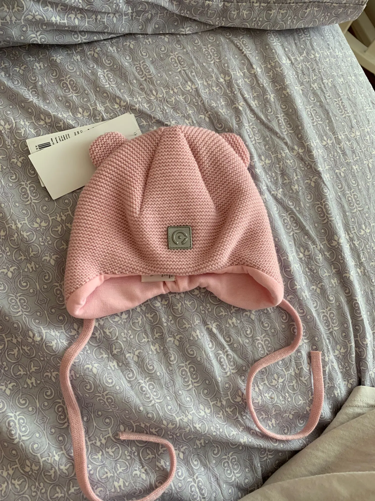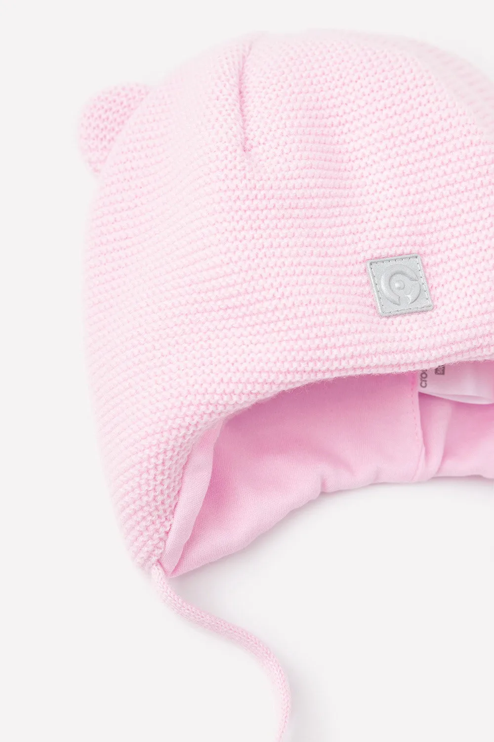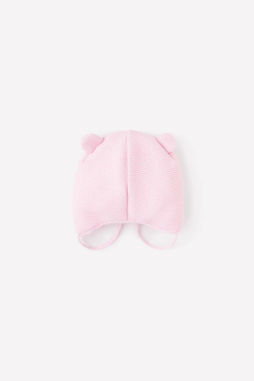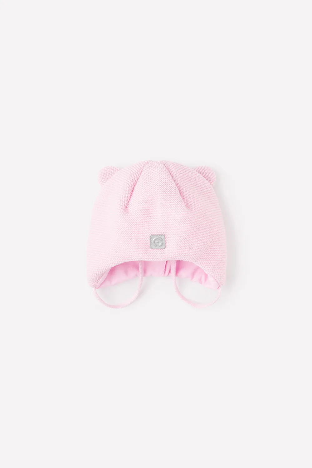 Описание: Розовая шапка из полушерсти на завязках. Внутри - мягкая подкладка из трикотажа интерлок. Украшена вязаными ушками на макушке. Для безопасности в тёмное время суток на передней части шапочки прикреплён светоотражатель.