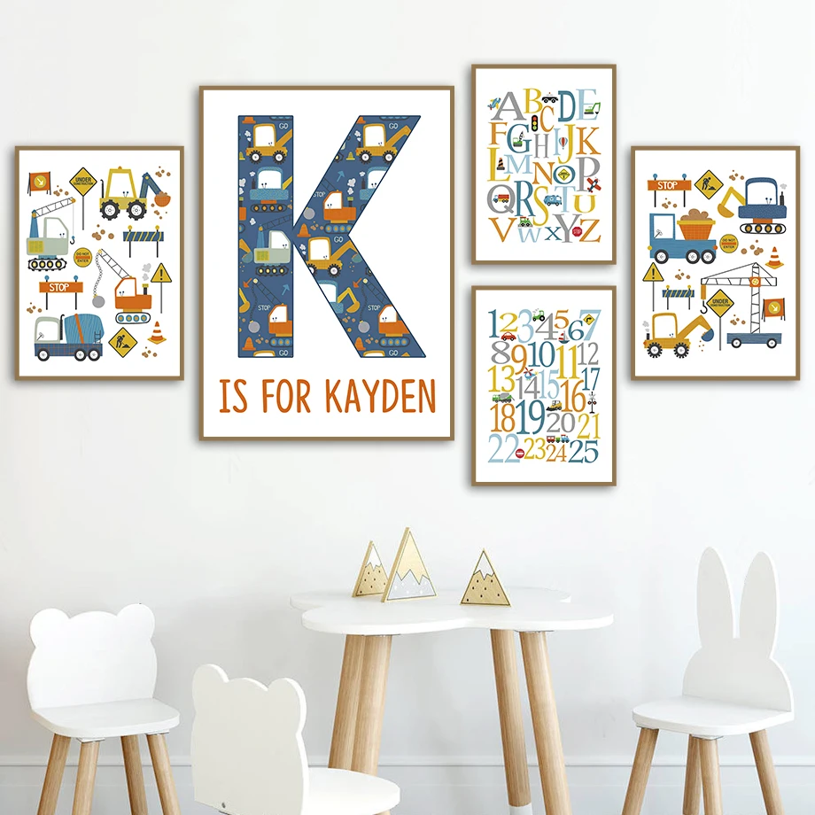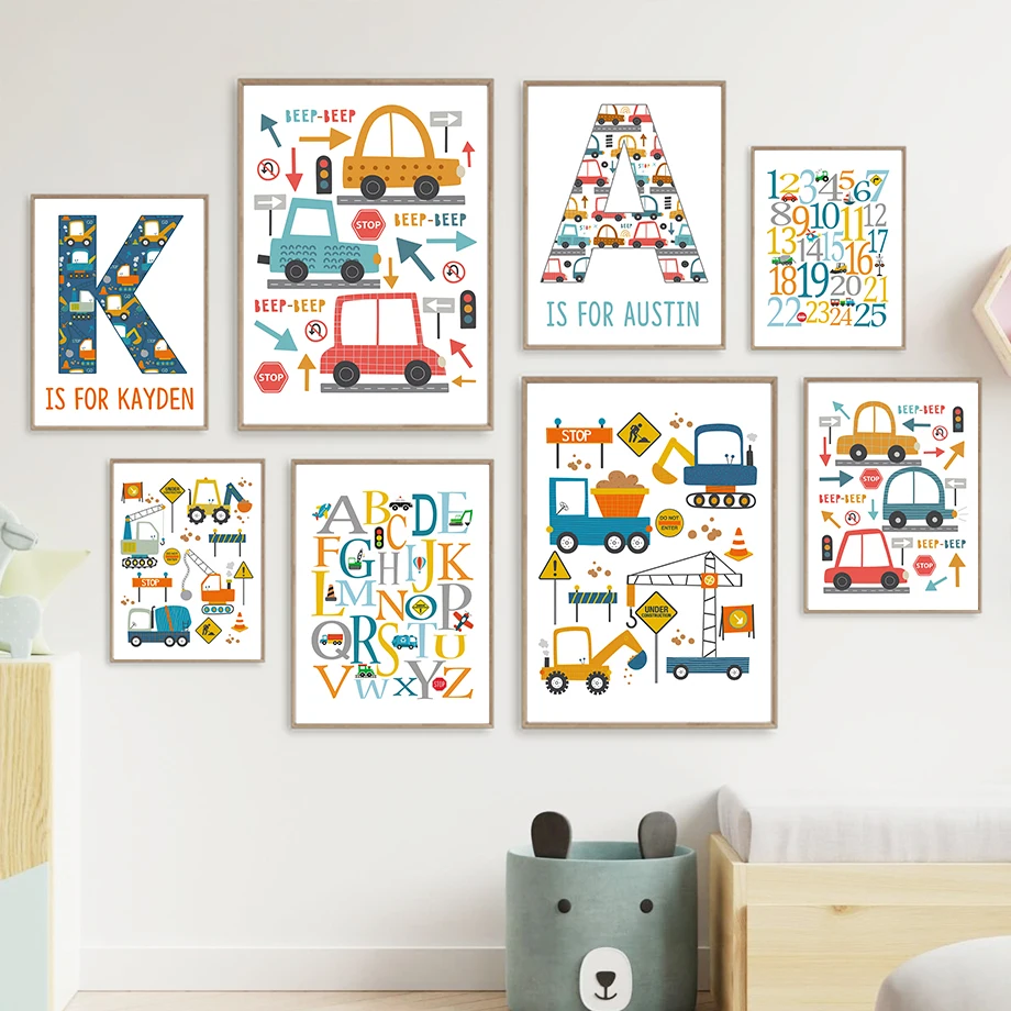 Алфавит с цифрами, автомобиль, Инженерная техника, настенная Картина на холсте, скандинавские плакаты и принты, Мультяшные настенные картины, декор детской комнаты