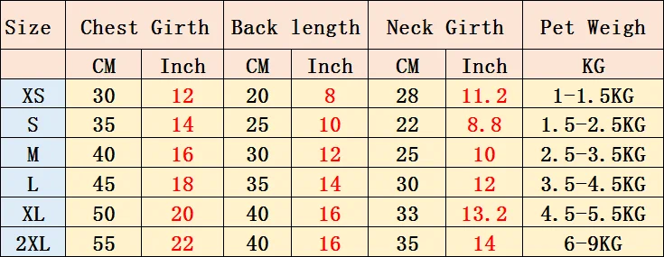 sizeXS (bust 30, back length 20cm), s bust 35, back length 25cm), m bust 40, back length 30cm), l bust 45, back length 35cm), XL (bust 50, back length 40cm), 2XL (French bucket 58cm, back length 40cm)