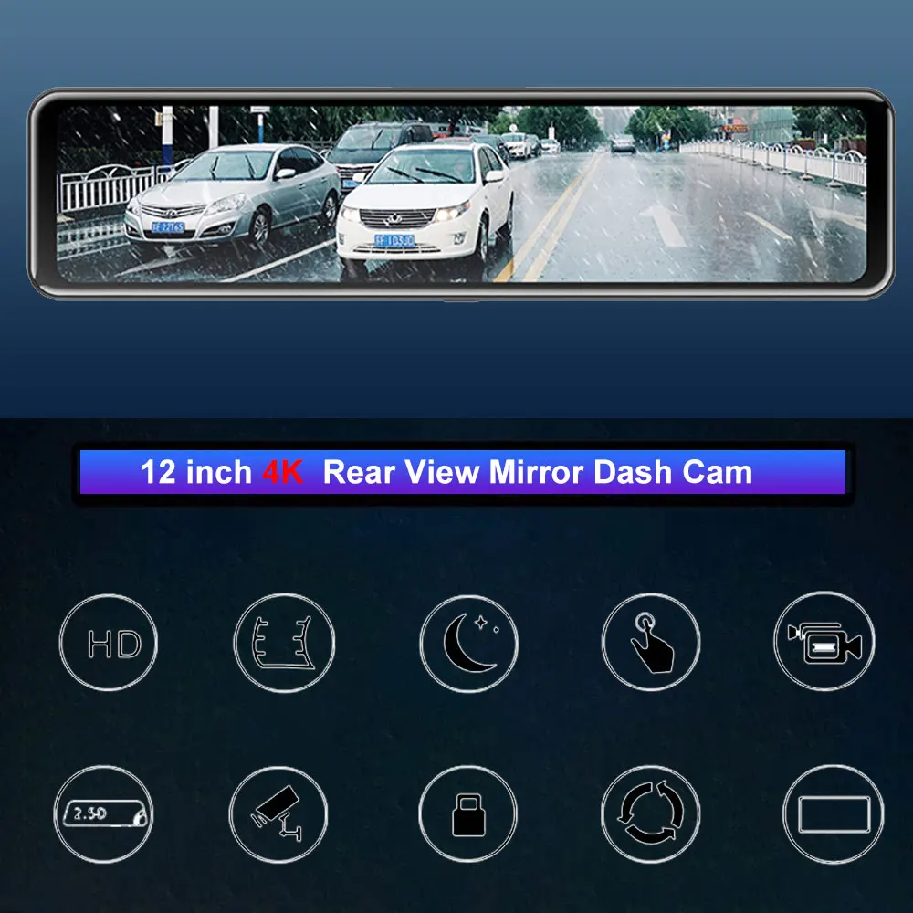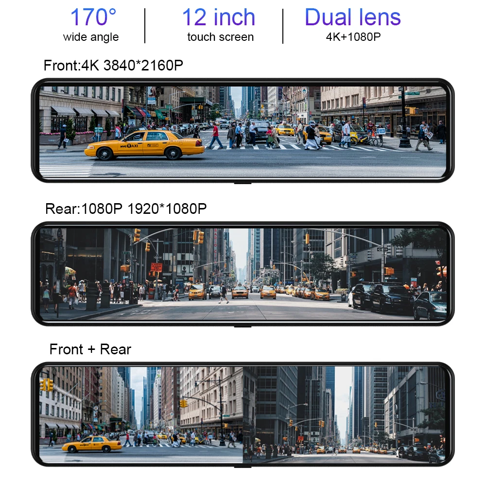 12 "IPS Сенсорный экран: двойной видеорегистратор спереди и сзади с 12" IPS сенсорным экраном обеспечивает движение и парковку деталей в режиме реального времени. Вы также можете непосредственно воспроизводить записанные видео на устройстве. С помощником по парковке, он автоматически отображает задний вид парковки, как вы обратном, обеспечивая безопасную и удобную парковку.