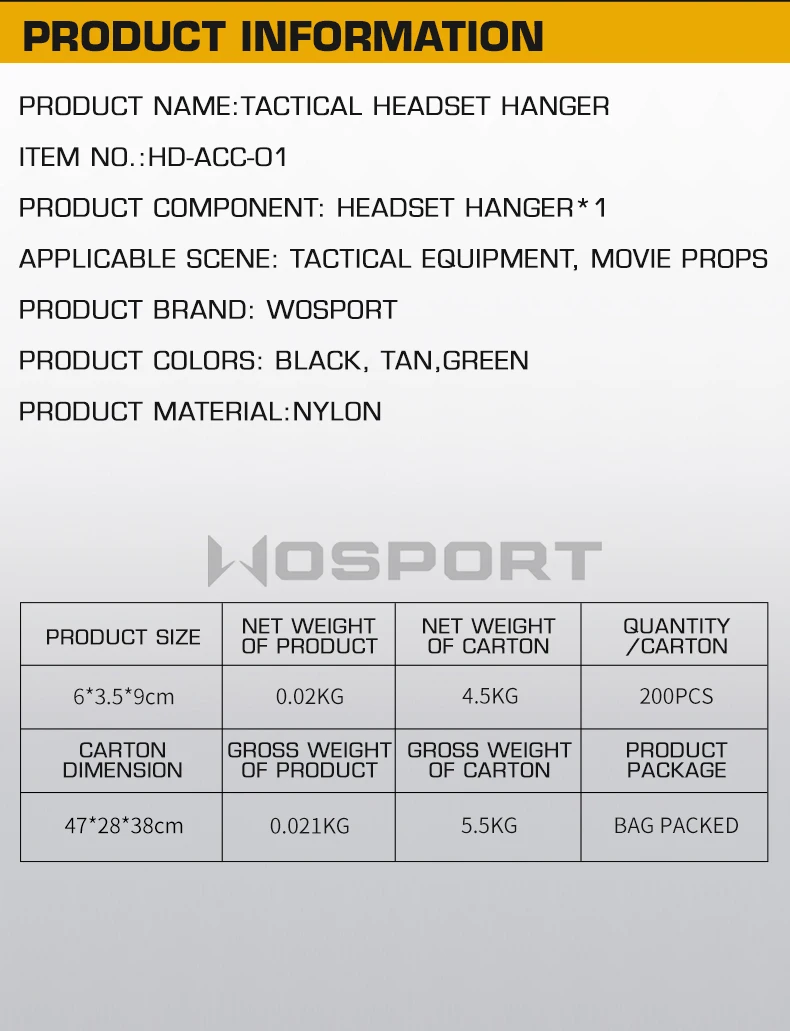 -- Название: тактическая вешалка для гарнитуры-- Бренд: Wosport-- Упаковка: пакет упакован-Размер: 6*3,5*9 см-Вес нетто: 0,02 КГ-- Вес брутто: 0,021 кг-Цвет: черный, OD,TAN-Основной материал: нейлон