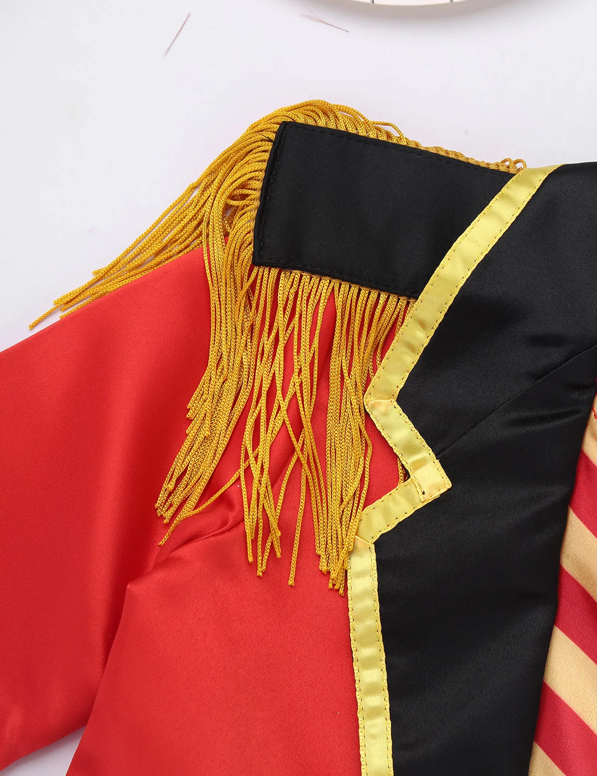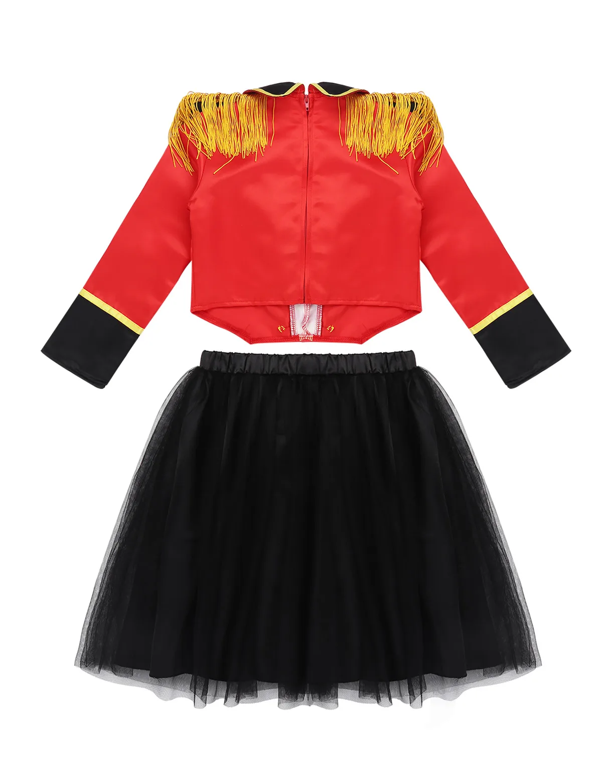 Особенности: Костюм изготовлен из полиэстера, атласа и сетчатого материала, ручная стирка. Таблица размеров означает возраст для девочек, но только для общего руководства. Куртка с длинными рукавами; Плечи с кисточками; Дизайн с лацканами. Дизайнерская рубашка в полоску. Украшен золотыми пуговицами. Скрытая молния сзади. Комплект из 2 слоев юбка-пачка с удобная эластичная резинка на талии, Топ Мягкий сетчатый слой, 1 атласную подкладку. Отличный праздничный подарок для вашей девочки. Подходит для Хэллоуина, карнавала, косплея, вечерние темы, ролевых игр, нарядов, фотографий, праздников и т. д.