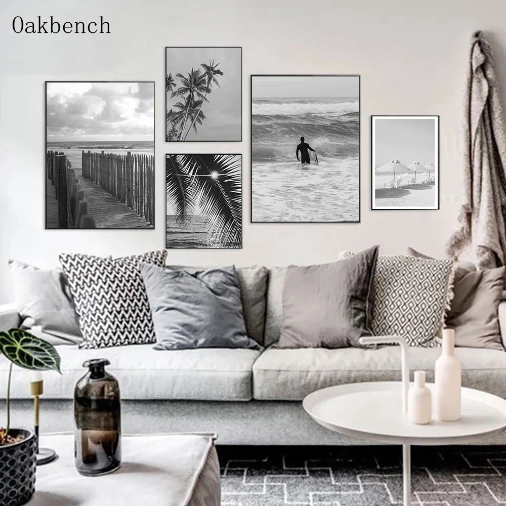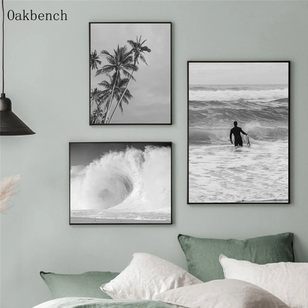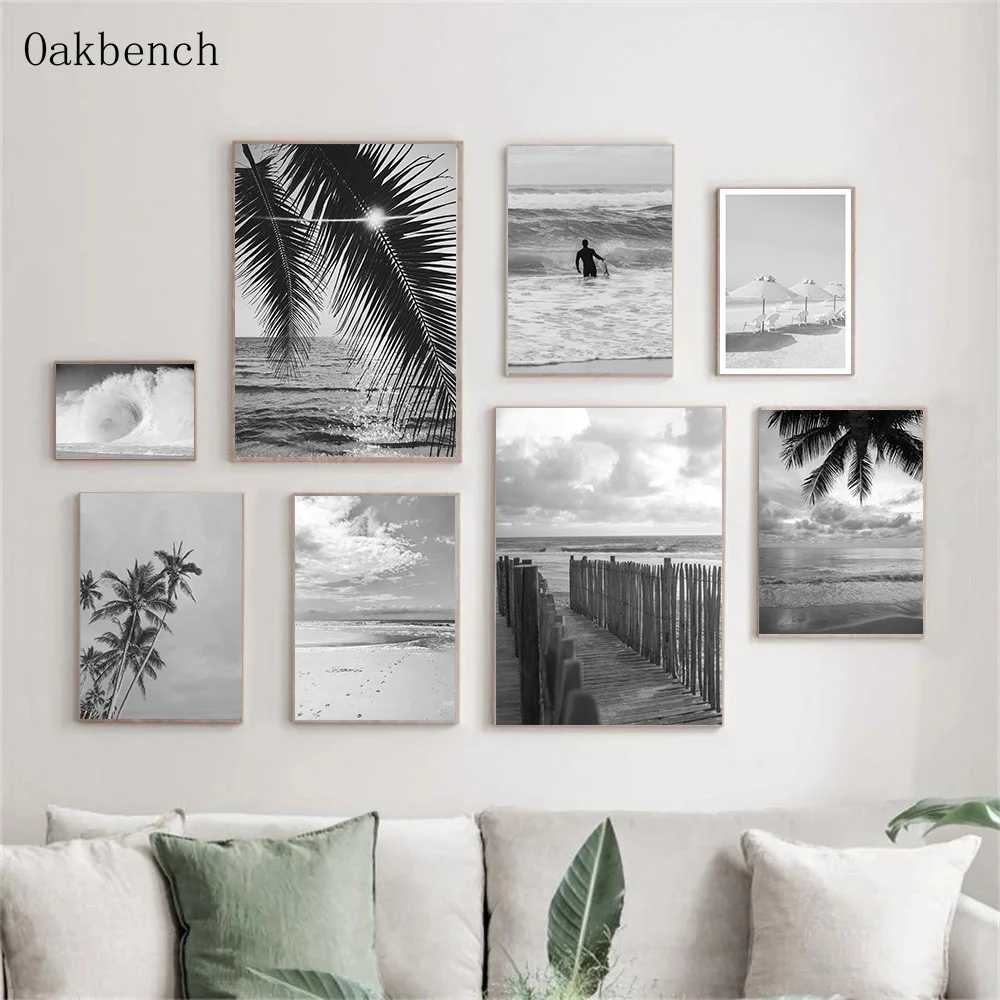 Плакаты с изображением кокосовой пальмы, черно-белых досок для серф...