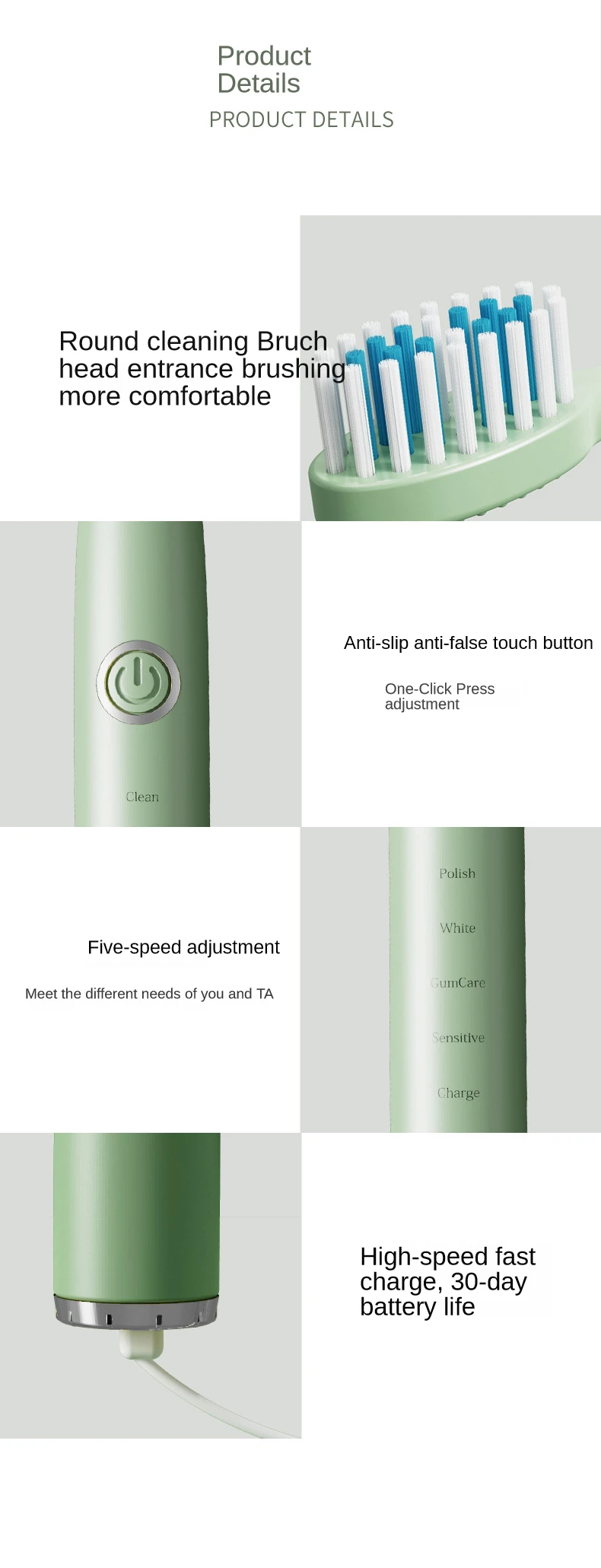 Супер звуковая электрическая зубная щетка es для взрослых и детей USB умная отбеливающая зубная щетка с таймером IPX7 Водонепроницаемая электрическая зубная щетка с 5 зубцамиКатегория продукта: электрическая зубная щеткаШестерни: 5 передачБренд: ZAIWANРежим питания: USBЕмкость аккумулятора: 800 мАч-1200 мАчТип двигателя: Бессердечный моторРежим питания: 5 передачПрименимые люди: ВзрослыеМатериал: АБС-пластик высокого качестваЦвет: белый [модель батареи], Розовый [модель батареи], зеленый [модель батареи], белый [заряжаемая модель], Розовый [заряжаемая модель], зеленый [заряжаемая модель]Характеристики продукта: 3 головки кистейМетод управления: кнопкаМаксимальная мощность: 2 ВтТип электрической зубной щетки: sonicФункция: многопозиционная регулировкаСрок службы: более 30 днейСкорость двигателя: 32000Технология оболочки: ABSПримечание: Модель аккумулятора не доставляет батарею, транспортировка аккумулятора будет проще, так как посылка будет возвращена, я надеюсь на понимание, с нетерпением жду работы с вами, самые искренние благословения
