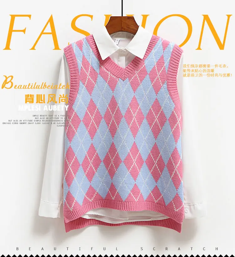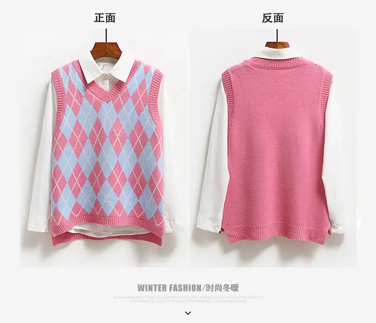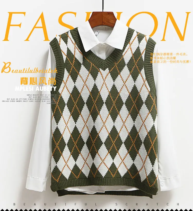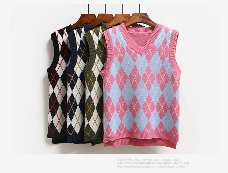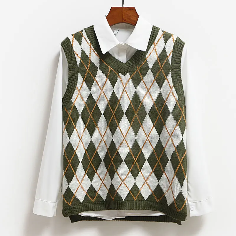 Женский зимний теплый жилет, свитер, вязаный пуловер, джемпер, топ без рукавов с V-образным вырезом, Женская винтажная модная одежда оверсайз с рисунком ромбиков, 2021