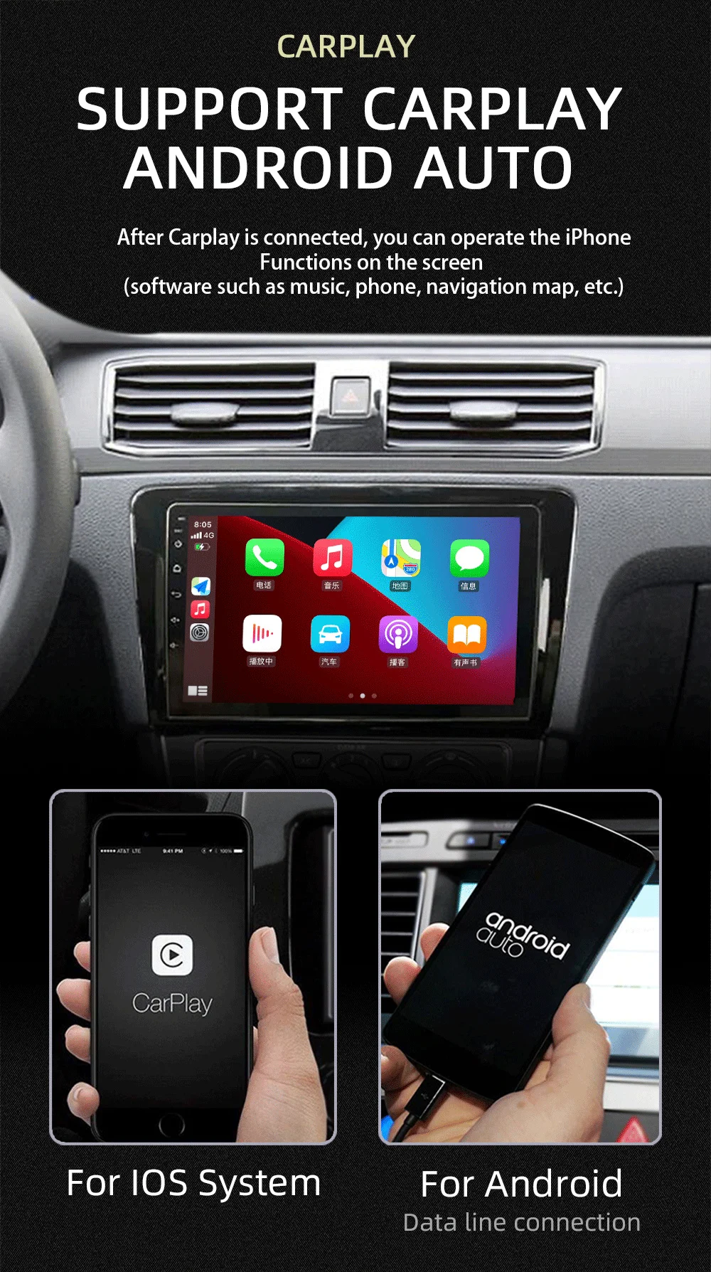 Поддержка подключения к iPhone через точку доступа Wi-Fi, поддержка подключения к телефону Android через usb-кабель и точку доступа Wi-Fi, фотографии телефонов, музыка, видео и т. д. будет отображаться на android-плеере