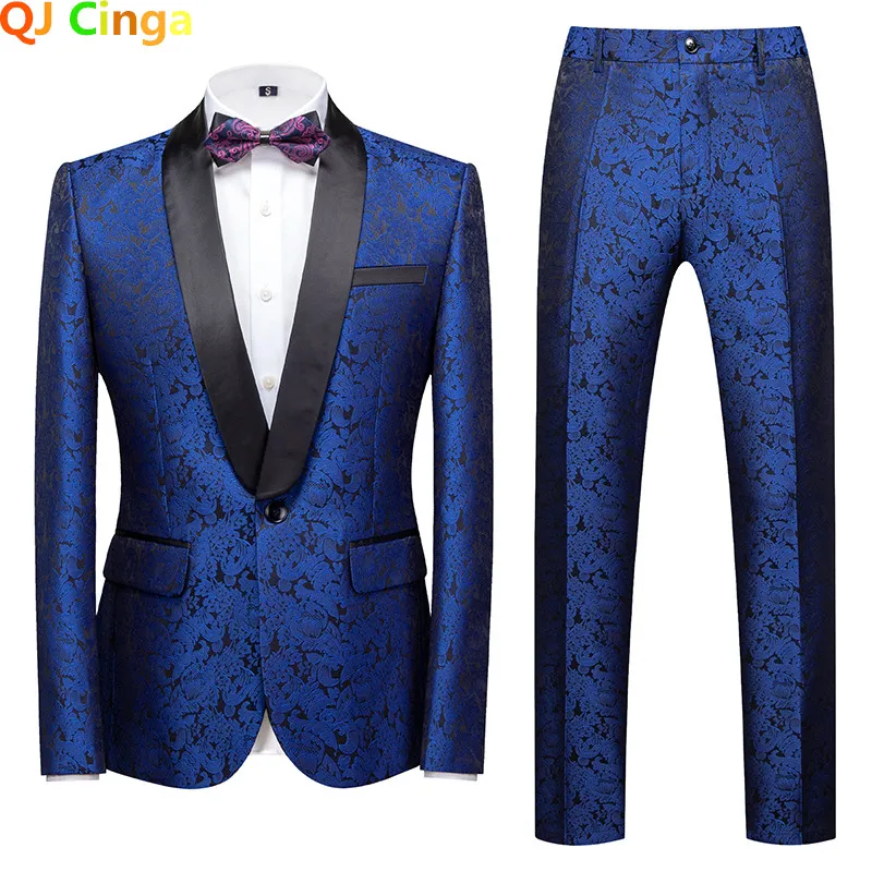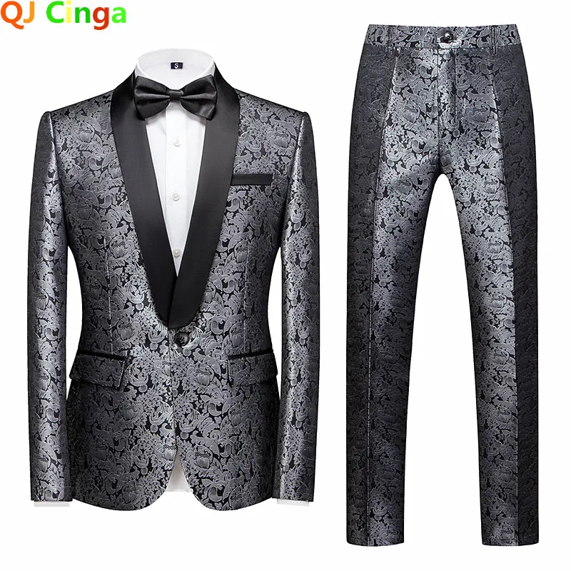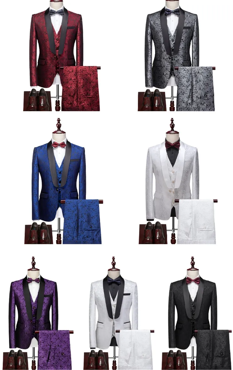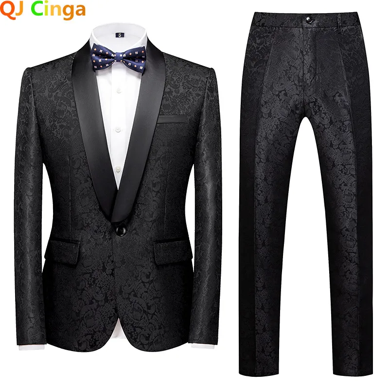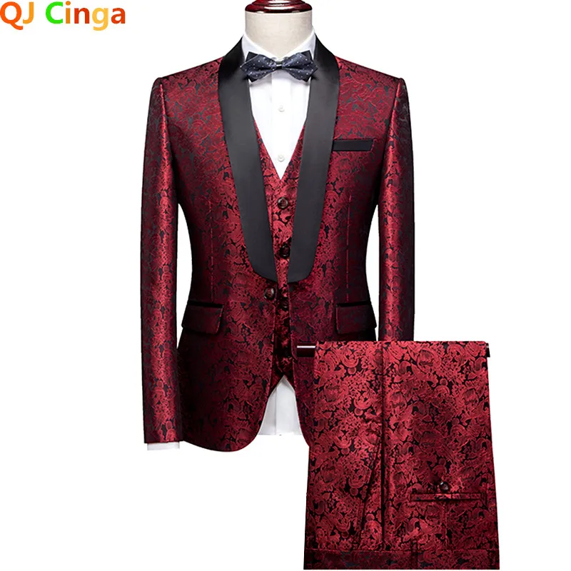 Мужские свадебные костюмы QJ CINGA, белые жаккардовые костюмы с черным атласным воротником, 3 шт., костюмы Terno для жениха для мужчин (пиджак + жилет + брюки) 6XL