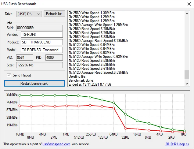 В Екатеринбург - ровно за две недели. Карту "из коробки" (с файловой системой exFAT) проверил в картридере Transcend TS-RDF8W с последней прошивкой TS2A. Скорость записи и чтения, вероятно, была ограничена возможностями картридера (запись стабильно упиралась в 65 МБ/с и выше не поднималась). Ошибок не отмечено. В CrystalDiskMark (последняя картинка) карта проверена после форматирования в FAT32 на Android 6.0. Продавец - молодец, можно смело заказывать карточки у него. Желаю ему успехов в торговле.