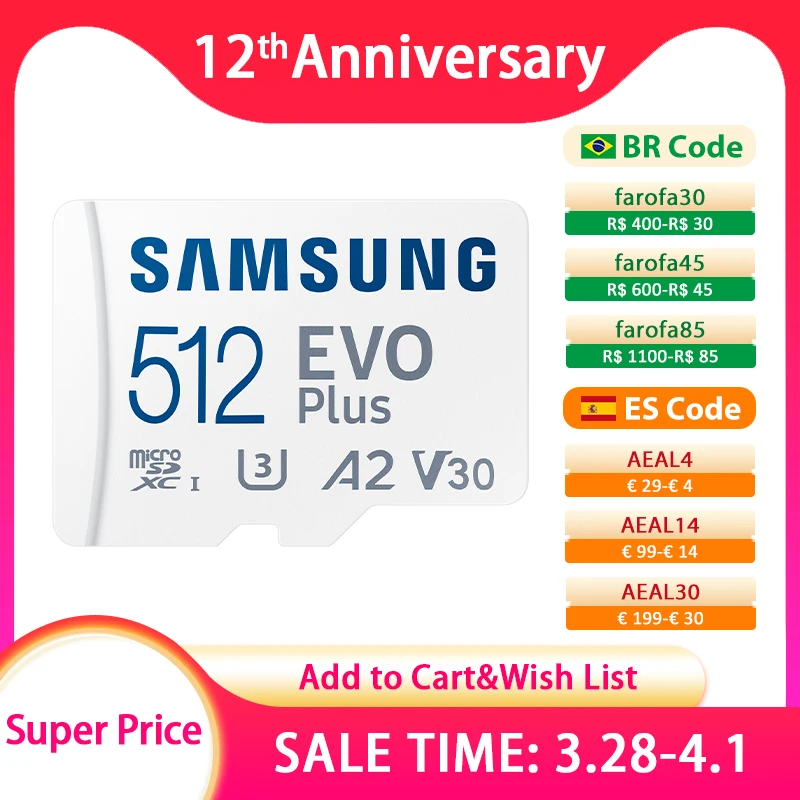 SAMSUNG TF-карта, 512 ГБ, 256 ГБ, 128 ГБ, A2 V30 SDXC 64 Гб A1 V10