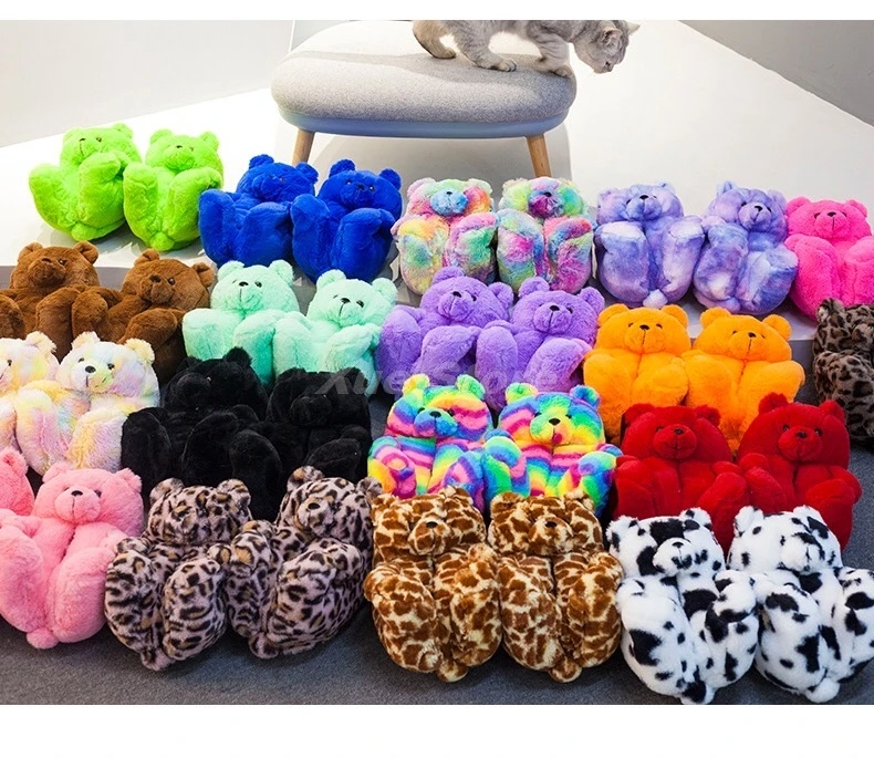 Плюшевые шлепанцы Teddy Bear для женщин, рождественские тапки, дом с милым мультяшным медведем, искусственный мех, сланцы, женские меховые шлепанцы