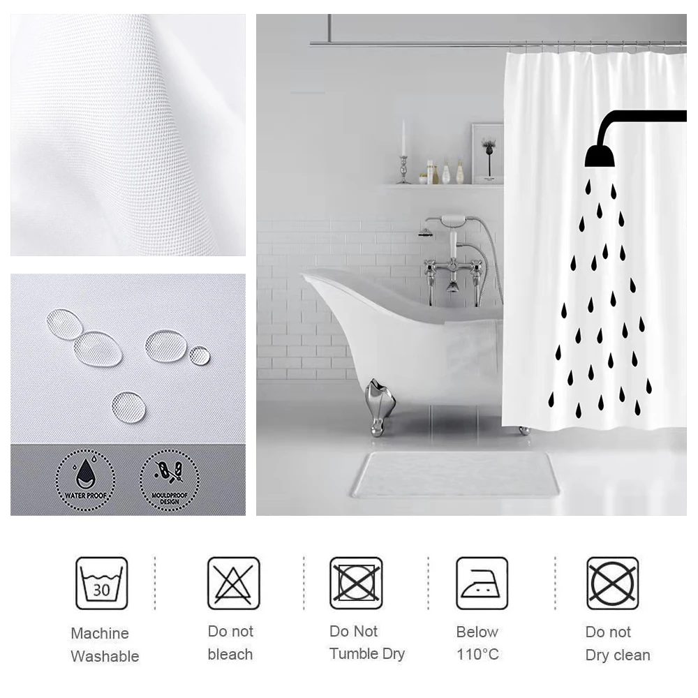 Узор: занавеска для душаМатериал штор: полиэстерХарактеристики: водонепроницаемый, мягкий и прочныйИспользование: украшение для дома и отеляПосылка включает в себя:1 занавеска для душа + 12 пластиковых крючков Очень мягкая ткань высокой плотности, удобная, Экологичная, хорошая вентиляция.