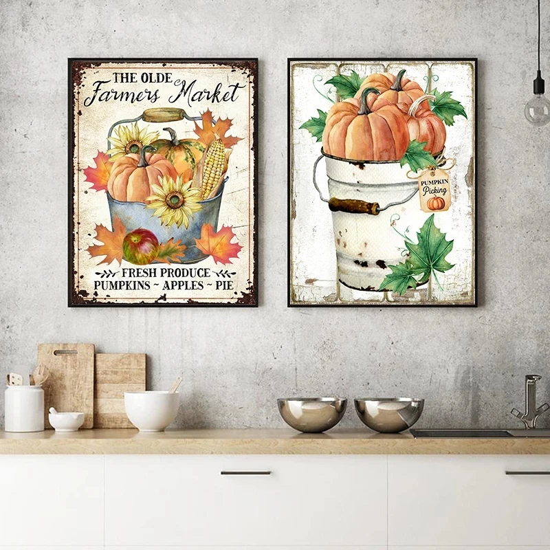 Ретро-постер фермерского рынка с изображением листьев и тыквы, деревенский металлический знак для падения, живопись на холсте, деревенский фермерский стиль, принты, Декор