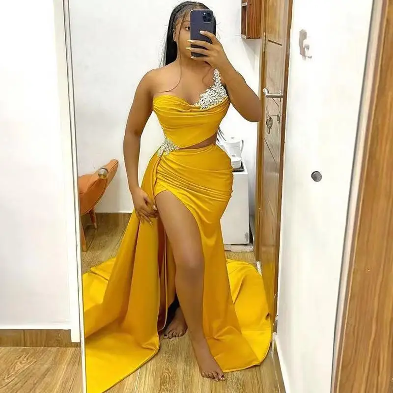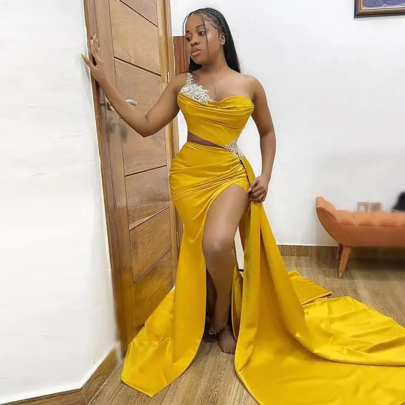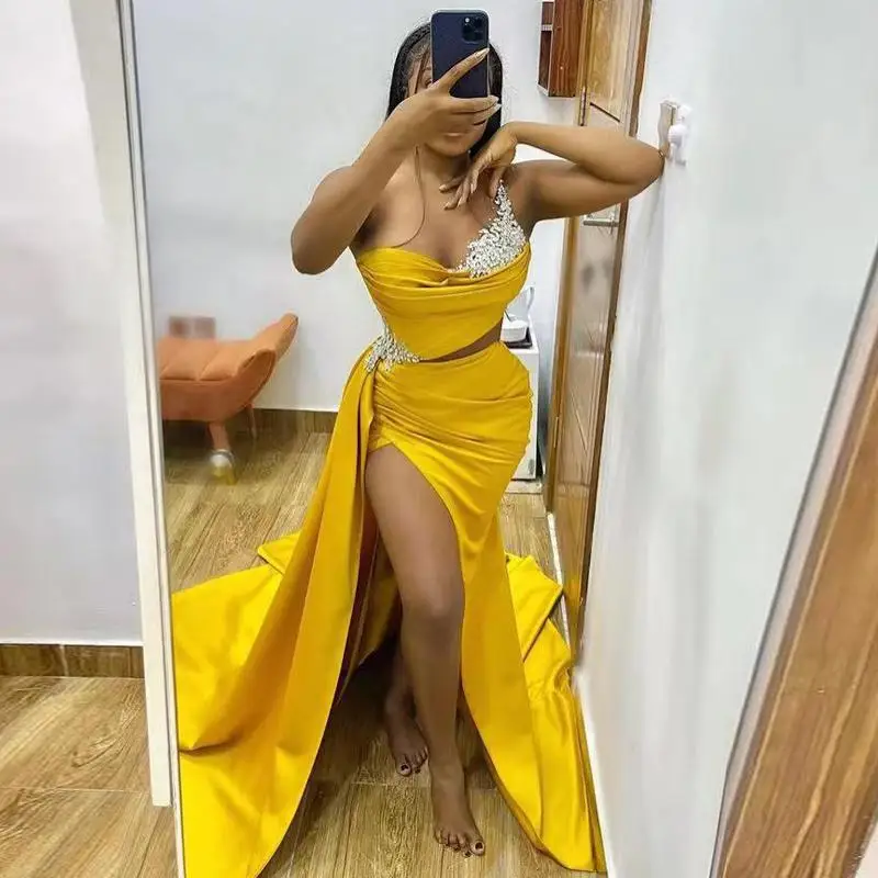 Атласное желтое платье-Русалка для выпускного вечера с вырезом по бокам и бусинами, плиссированное вечернее платье с Боковым Разрезом, вечерние платья Aso Ebi