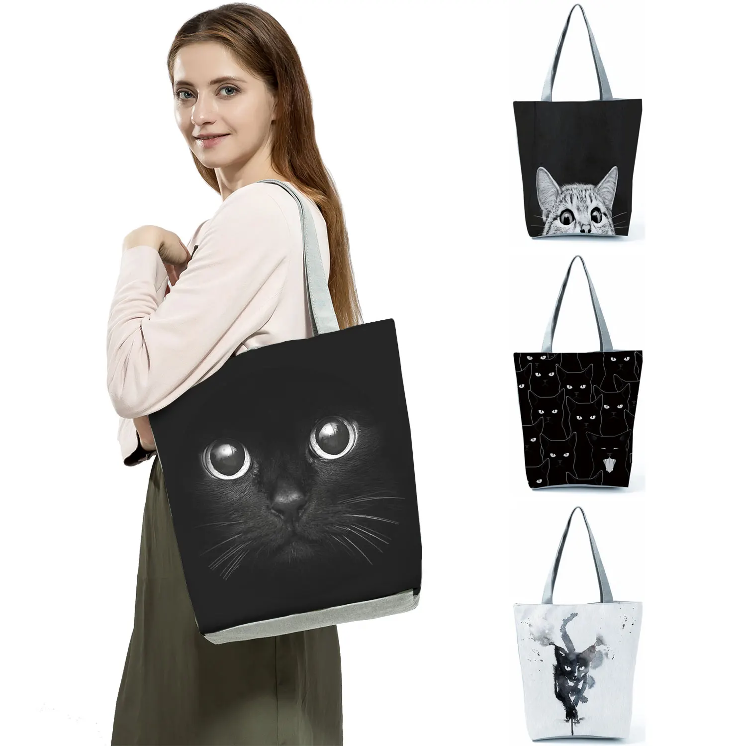Дизайнерские сумки, женская сумка 2021 Милая Черная кошка, сумка-шоппер с принтом, многоразовая Повседневная сумка на плечо для офиса, пляжная сумка для путешествий