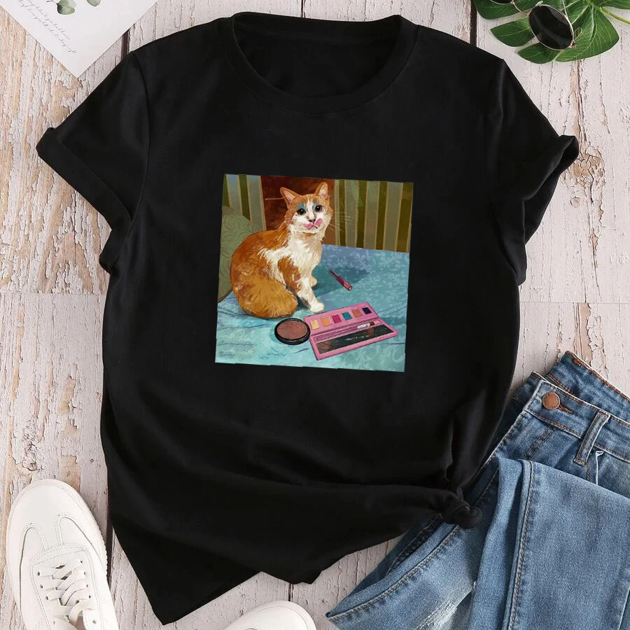 Забавная футболка с котом для женщин, топы для девочек, 90s, Kawaii, одежда, милые футболки с рисунком кота, хлопковые Модные женские футболки, винтажная блузка унисекс100% хлопок (серый is90 %, темно-серый 50%, другие цвета-100% хлопок)