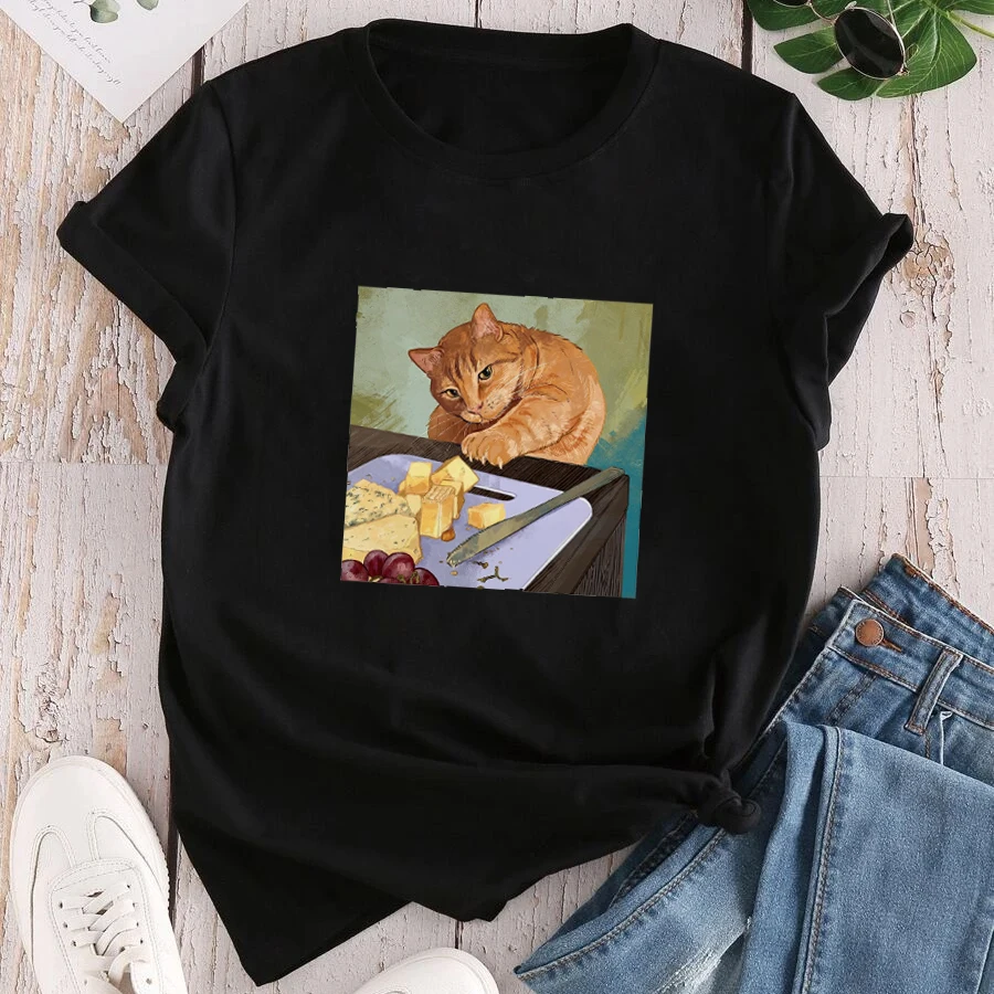 Футболка женская с рисунком кошки, рамен и мини-кошки, лето 2021