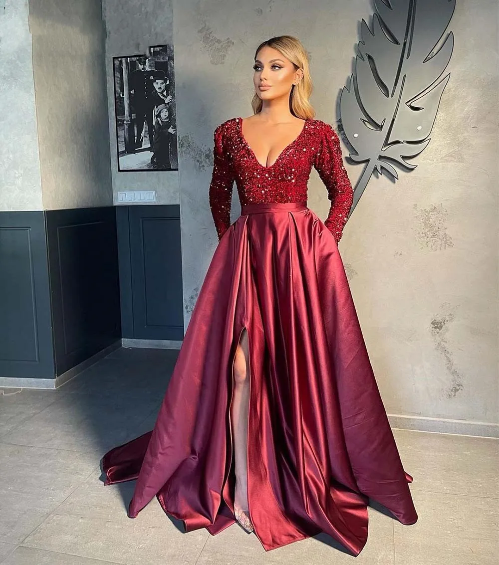 Женское длинное вечернее платье Vinca Sunny, бордовое атласное платье-трапеция с V-образным вырезом, длинным рукавом и блестками, в Дубае, 2022