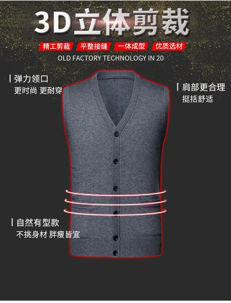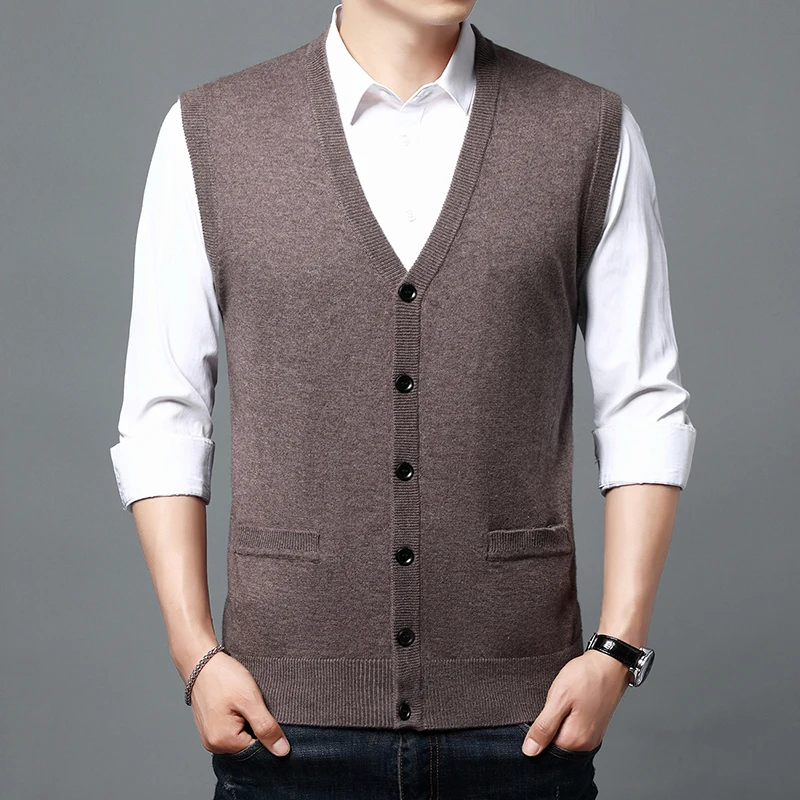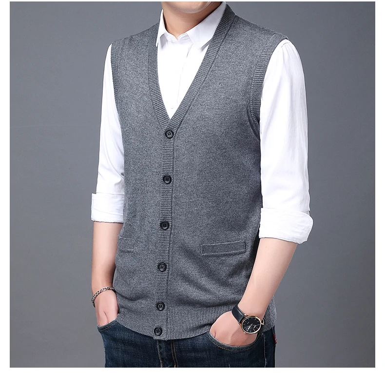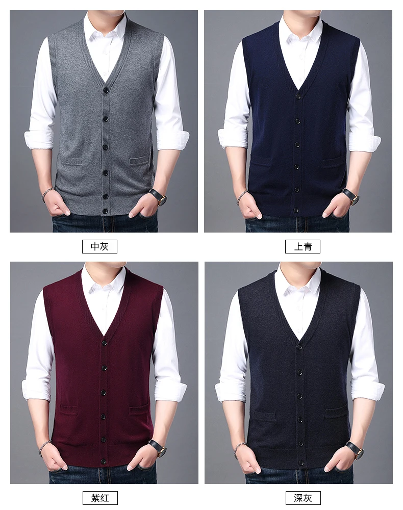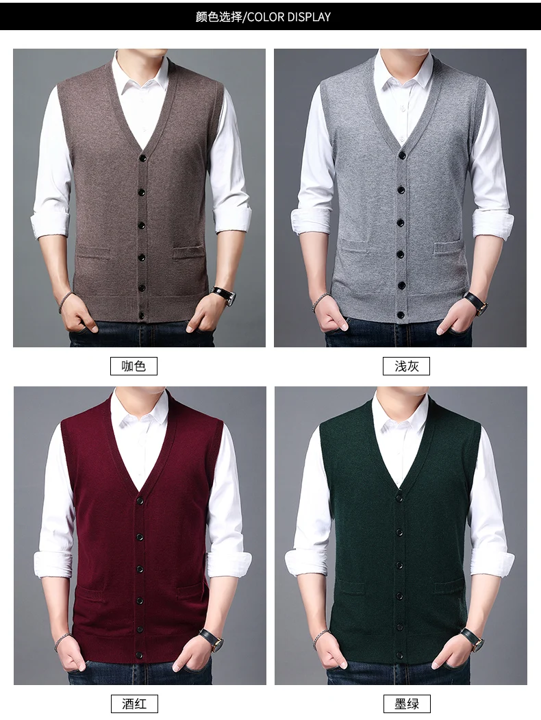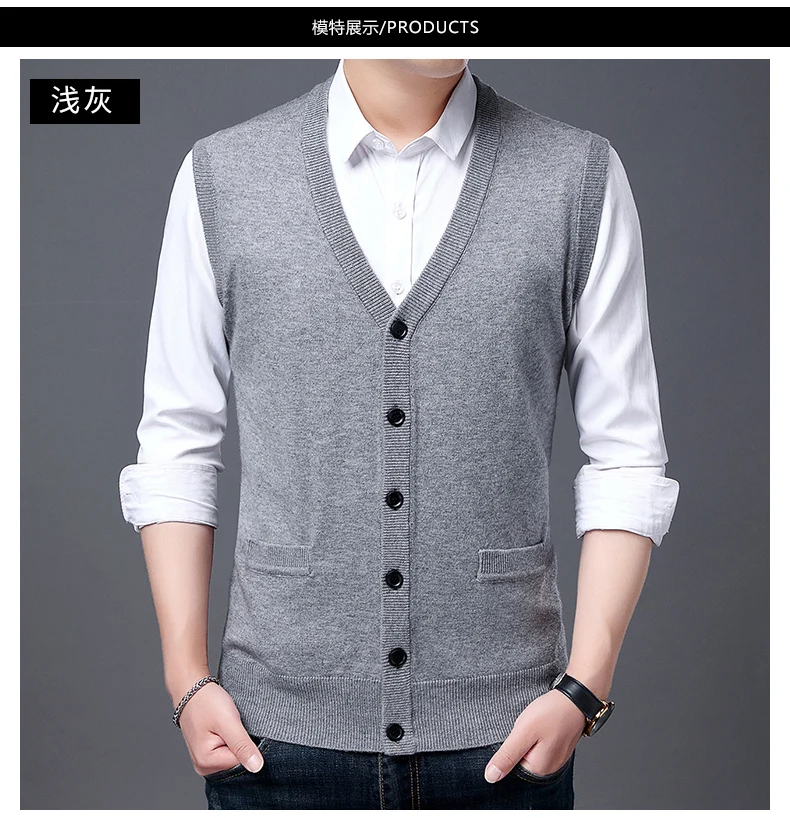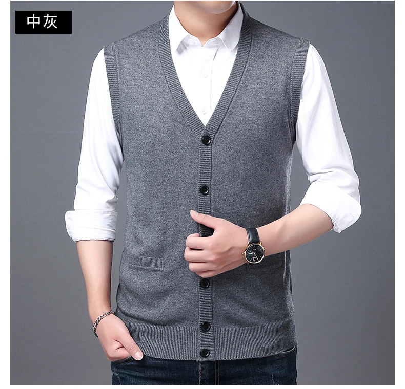 Мужской однотонный шерстяной кардиган, осенне-зимняя трикотажная одежда на пуговицах, мужские свитеры без рукавов, повседневный вязаный кардиган с V-образным вырезом, жилет