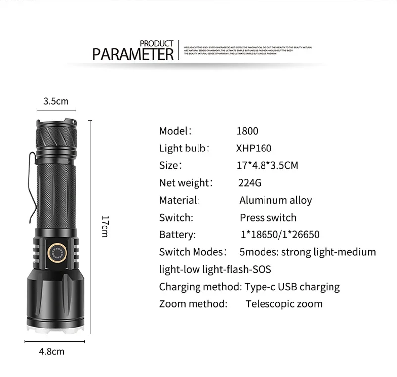 Модель лампы: XHP160Материал линз: оптические линзыРабочая передача: 5 передач (сильный, средний, слабый, вспышка, SOS)Размер продукта: 170x48x35mmПрименимые Аккумуляторы: 26650x 1/18650x1 (тип верхнего наконечника)Класс водонепроницаемости: IPX5Мощность продукта: 50 ВтМатериал изделия: алюминиевый сплавРабочее напряжение: 3,7 вЦвет изделия: черныйПрямая зарядка: TYPE-C Прямая зарядка USB (с выходным и входным двойным интерфейсом)Цифровой зум: Телескопический фокусПоложение переключателя: Средний кнопочный переключательДисплей питания: 4 светодиодных индикатора, каждый свет представляет 25% мощностиВес нетто продукта: 280 г (один фонарик)