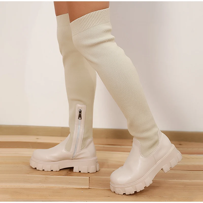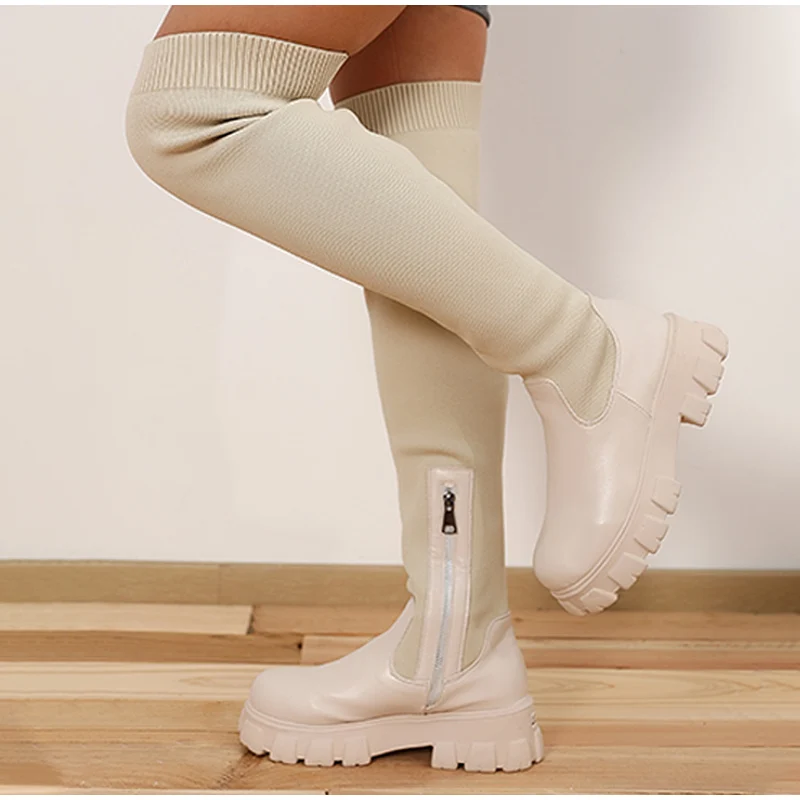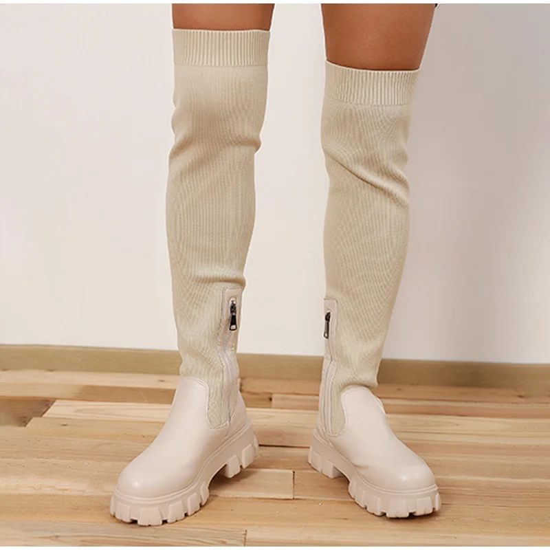 Женские модные сапоги выше колена, женские сапоги из искусственной кожи с круглым носком, однотонная женская обувь на толстой подошве и молнии, 2022