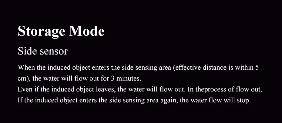 Для предотвращения случайного касания Боковое Сенсорное окно Без мусора на расстоянии 10 см Нижний датчик окна Высота от нижней части бассейна должна быть не менее 15 см Мгновенный режим Мытье лица и мытье нового датчика забавного дна, чтобы удовлетворить краткосрочный спрос на воду. Когда датчик входит в нижнюю зону обнаружения (с ограниченным расстоянием 10 см), начинается вода. Когда датчик находится вдали, вода останавливается. Если датчик находится в нижней области зондирования, вода автоматически прекратится через более чем 20 секунд разрядки воды, что необходимо для ежедневной очистки. Режим хранения воды Боковые и боковые датчики кастрюль и сковородок удовлетворены требованиями к использованию воды. Когда датчик входит в зону обнаружения сбоку (с ограниченным расстоянием 5 см), вода начинает течь. Время сброса воды длится 3 минуты, и вода остается, даже если сенсорный объект покидает место. Если датчик снова входит в зону бокового зондирования во время процесса сброса воды, вода может быть остановлена в любое время, что является хорошим выбором для хранения воды.