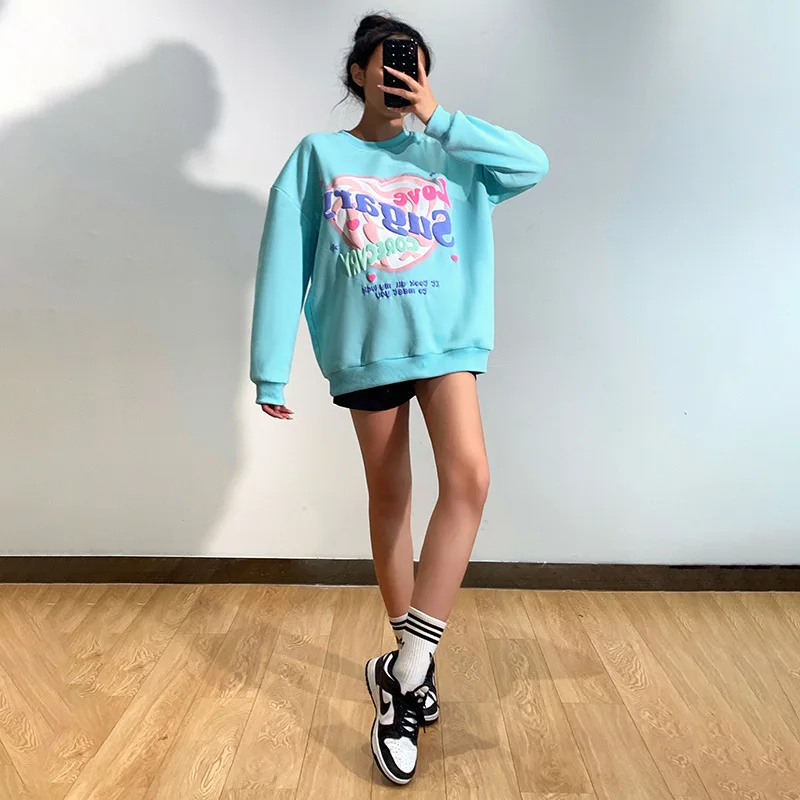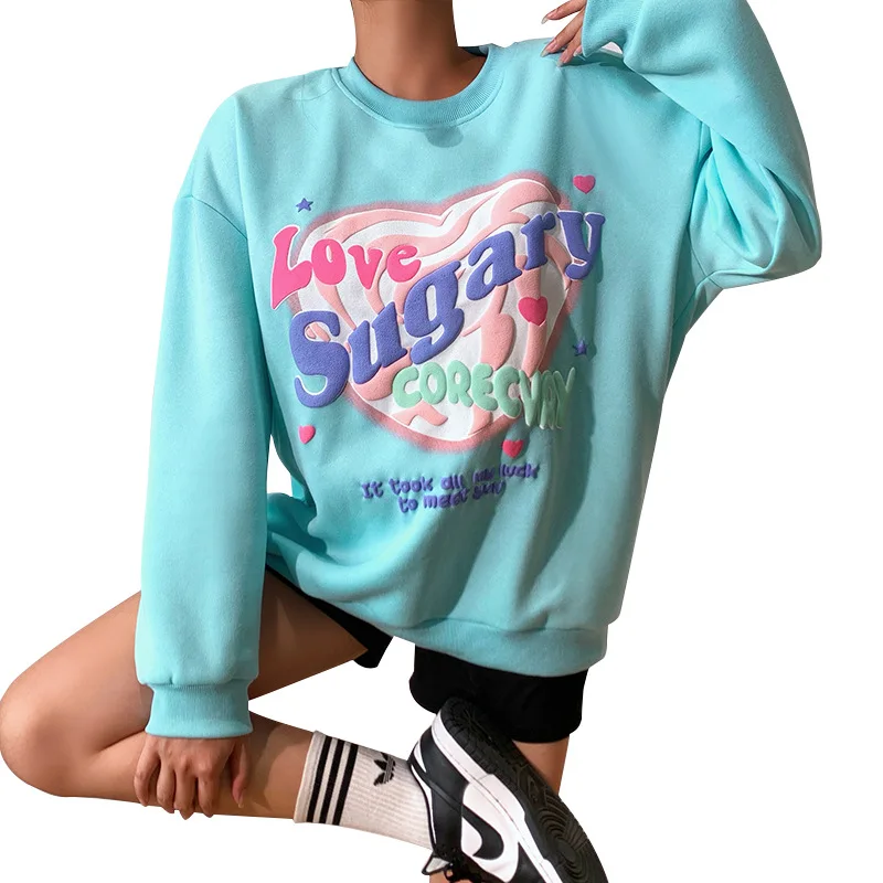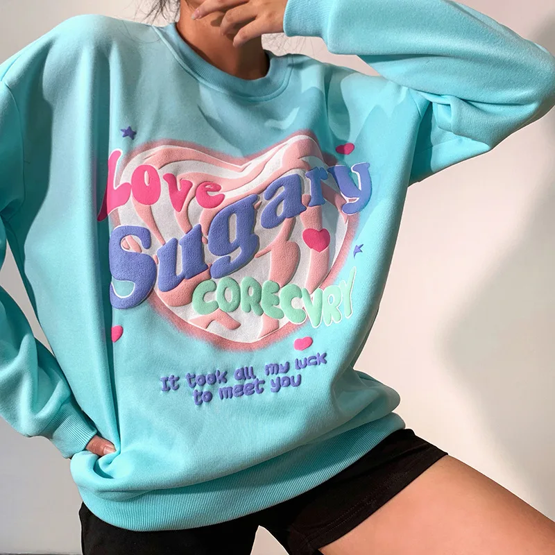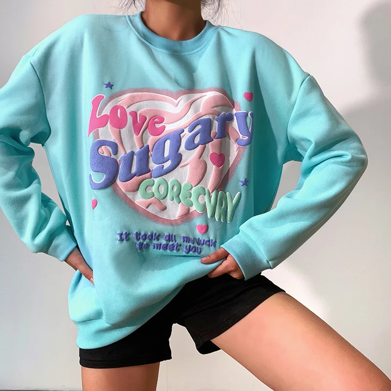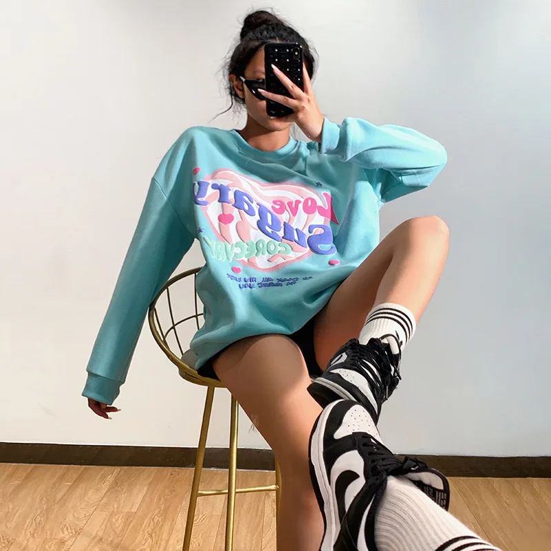 Женский свитшот в стиле Харадзюку, Свободный пуловер с круглым вырезом и надписью Love, толстовка с капюшоном, топы с длинными рукавами и принтом на весну и осень
