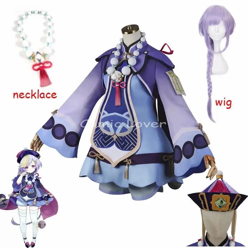 Женский костюм для косплея Genshin Impact Qiqi, парик, шляпа, женское фиолетовое платье для хэллоуивечерние с зомби, аниме, одежда, униформа
