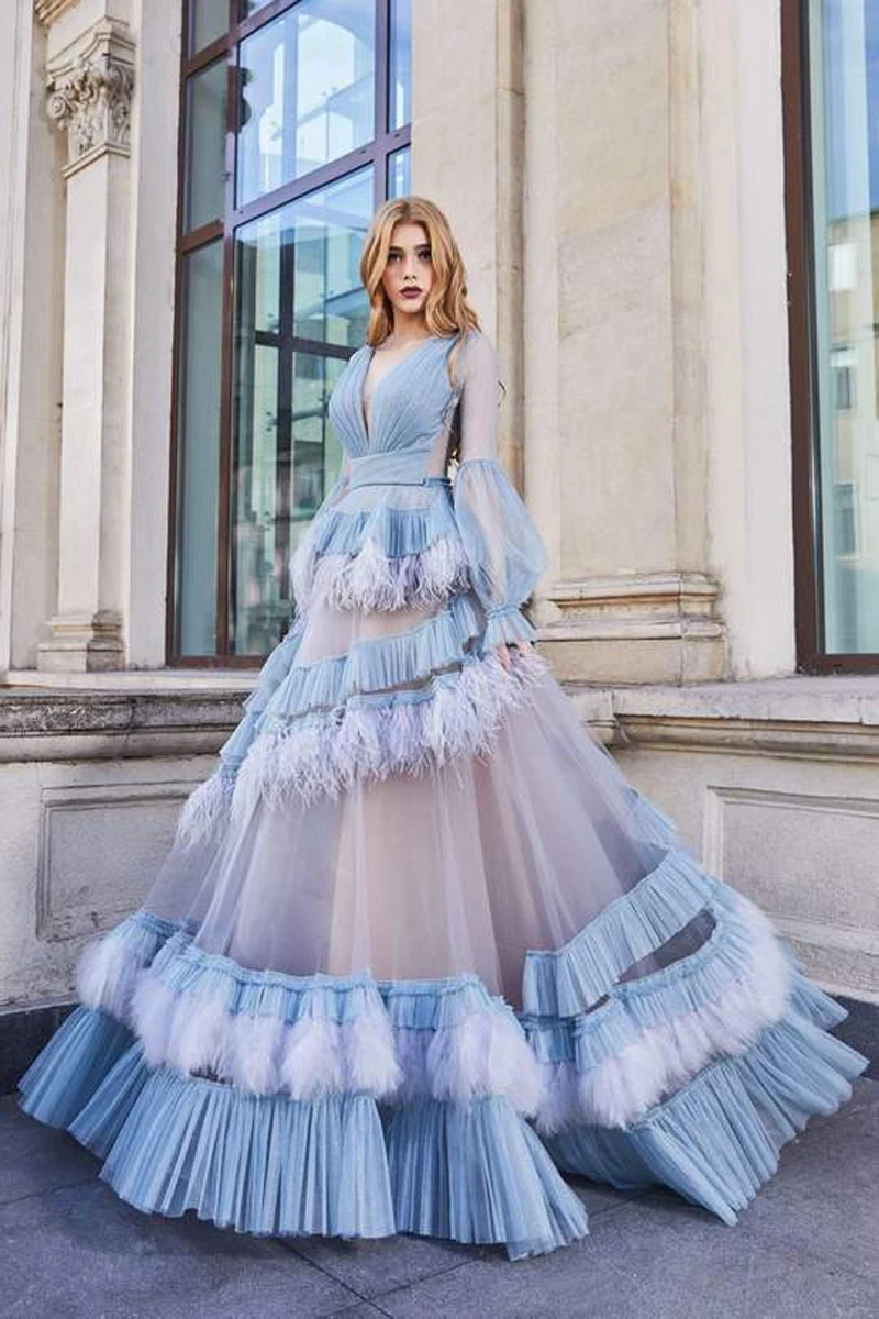 Прозрачное платье для выпускного вечера с V-образным вырезом светло-голубое бальное платье из тюля с длинным рукавом Длинные вечерние платья с оборками в виде перьев элегантное платье