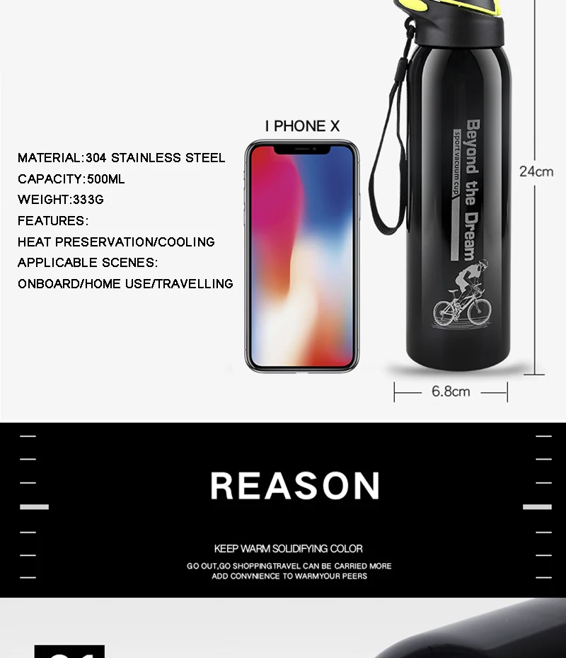 Спортивный термос, бутылка для воды, 500 мл, Термокружка Из Нержаве...
