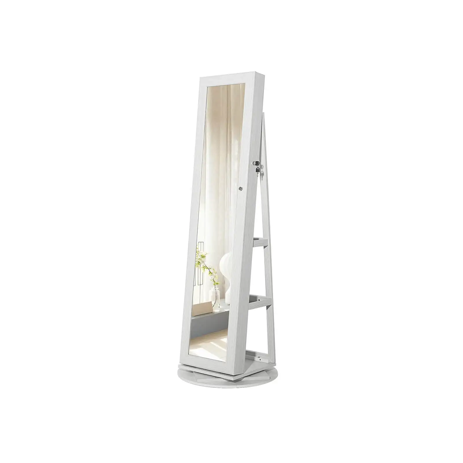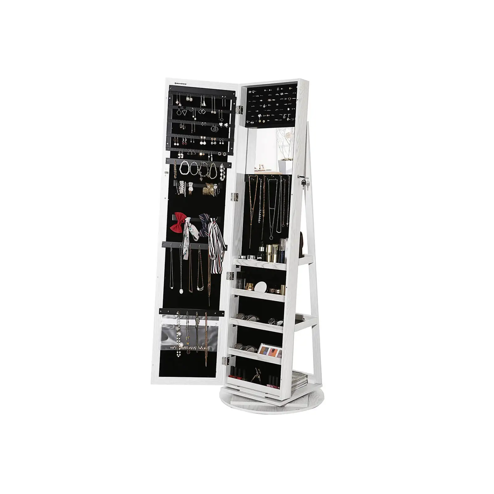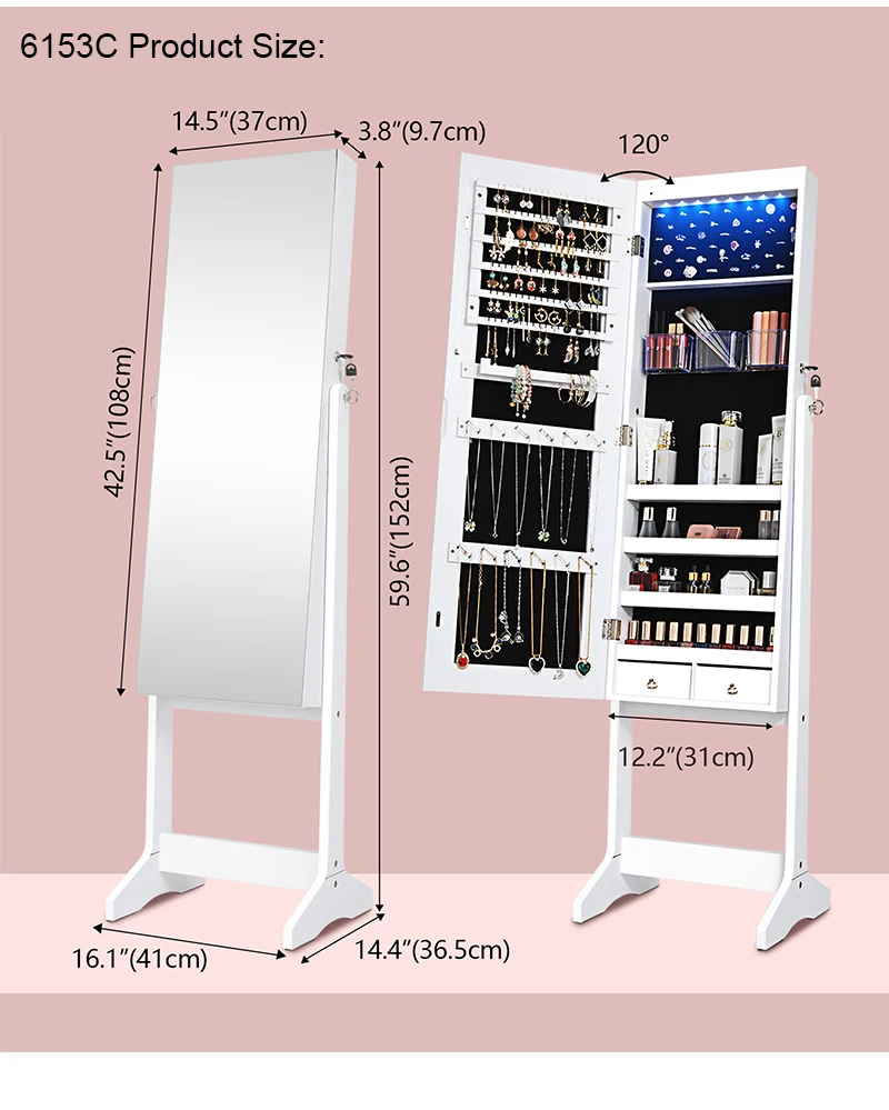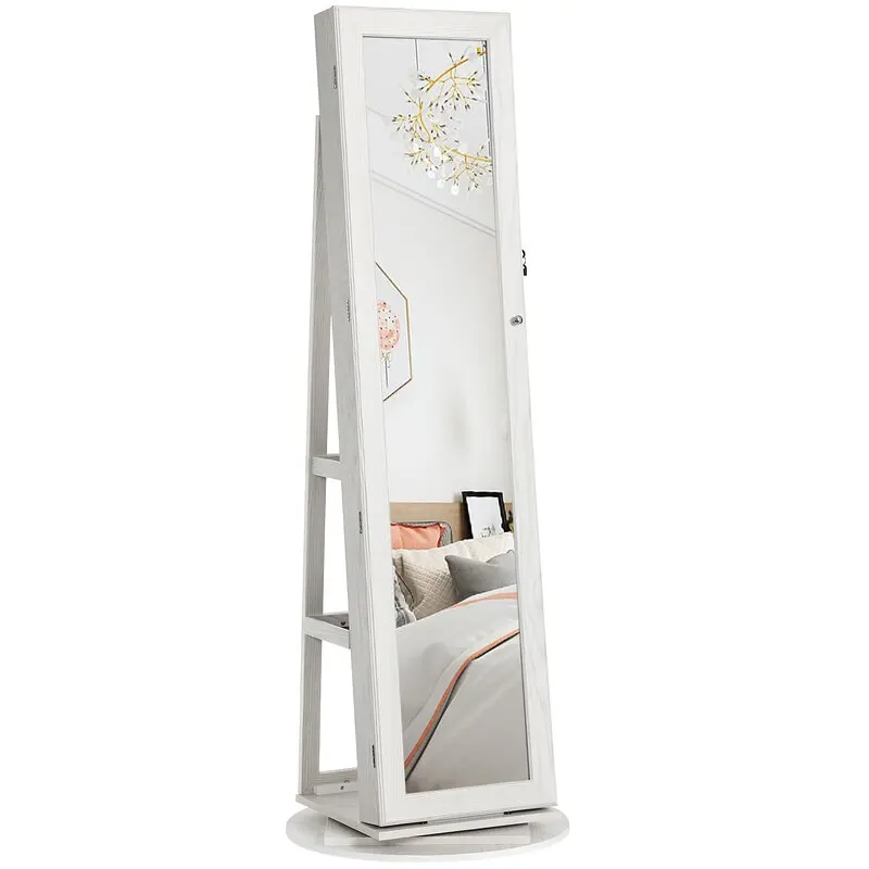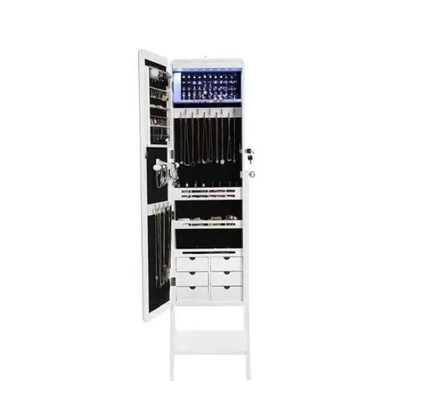 Ювелирный шкаф, ювелирный шкаф с зеркалом, ювелирный дисплей с зеркалом. С помощью этого красивого ювелирного шкафа с зеркалом ваши ювелирные изделия могут быть идеально сохранены и доступны по вашему желанию. Благодаря большому пространству для хранения вы можете организовать свою коллекцию ювелирных изделий по теме и таким образом защитить их от пыли. Ванная комната, спальня или Гардеробная. Зеркало поворачивается и может быть отрегулировано на три разных уровня и таким образом адаптируется к потребностям и различным размерам каждого человека. Наш красивый ювелирный шкаф оснащен практичным зеркалом, созерцающим на вас рендеринг ваших ювелирных изделий.