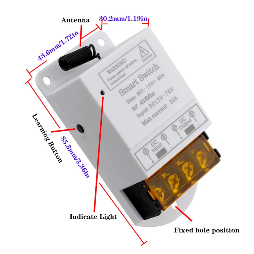 Характеристики433MHz High Power Button DC 12V 24V 1CH 30A Remote Control Switch