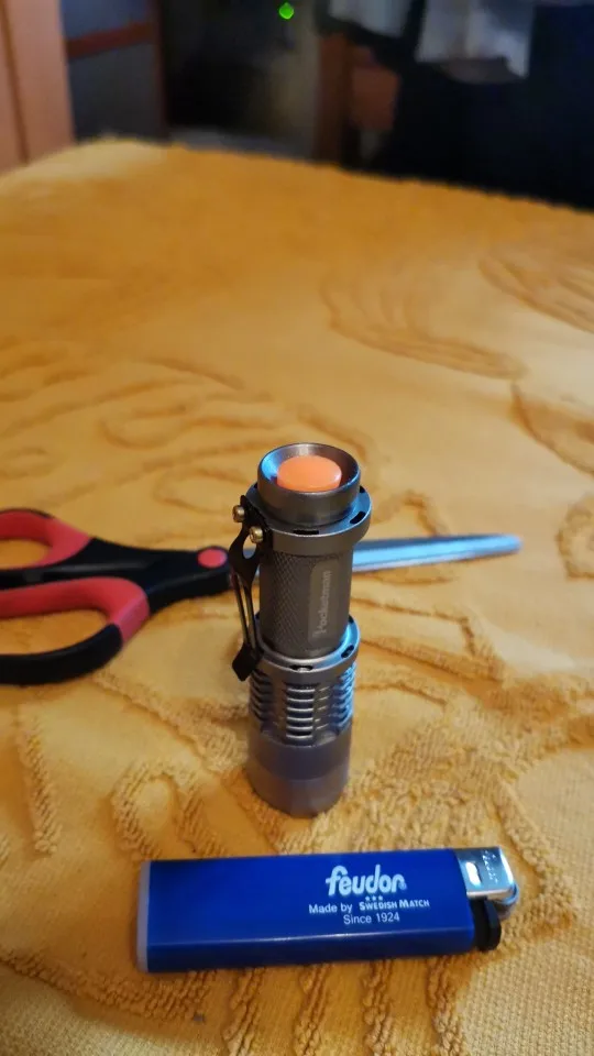 Доставка 6 дней. Фонарь странноватый - батарейный отсек больше батарейки АА, но питание 1,5 В именно от АА. Батарейка внутри болтается, но контакт довольно плотный. Как все китайские фонарики, нет памяти на режим привыключении и повторном включении - включается тупо на следующем режиме после предыдущего. Режимов 3: слабый, сильный, стробоскоп. Есть увеличение, но все это люменов так на 70, не больше.