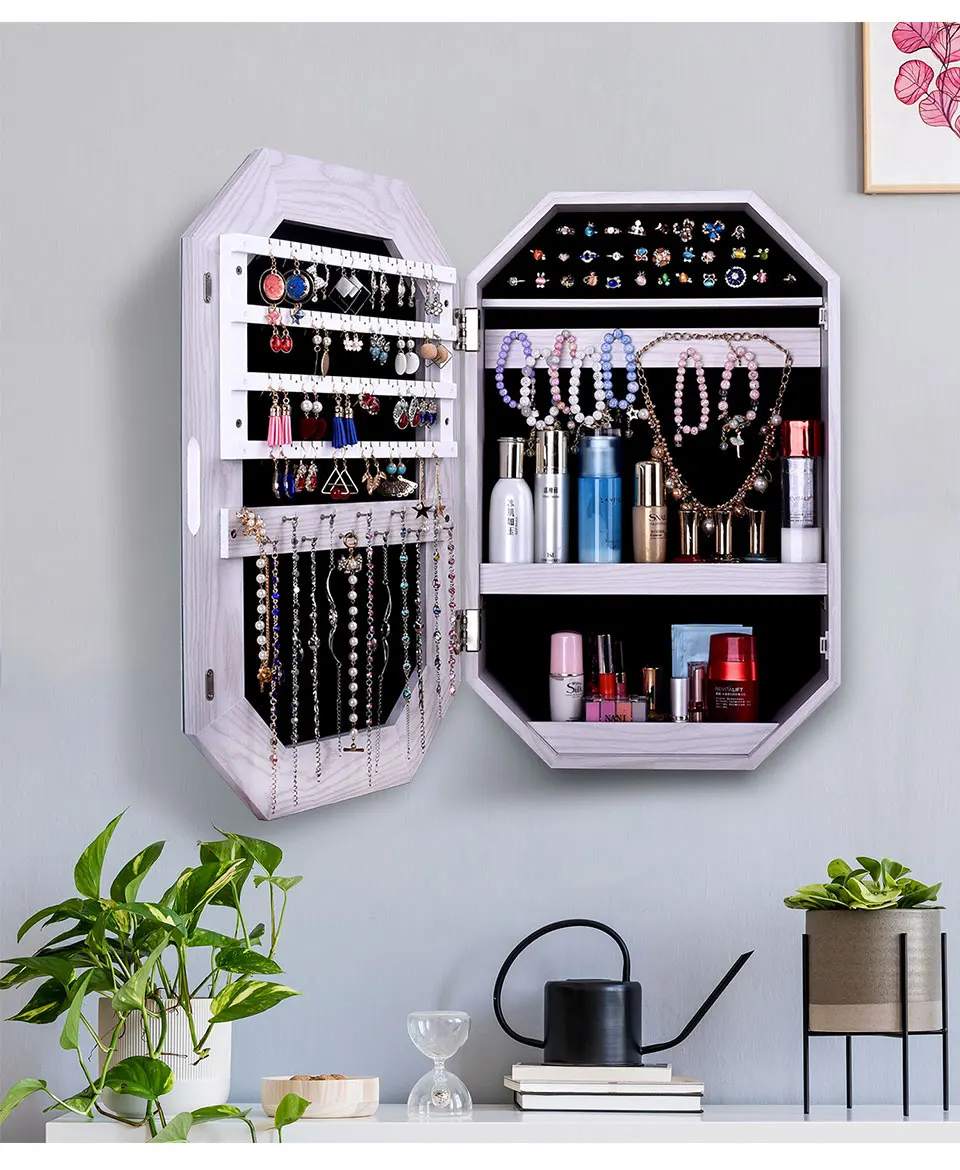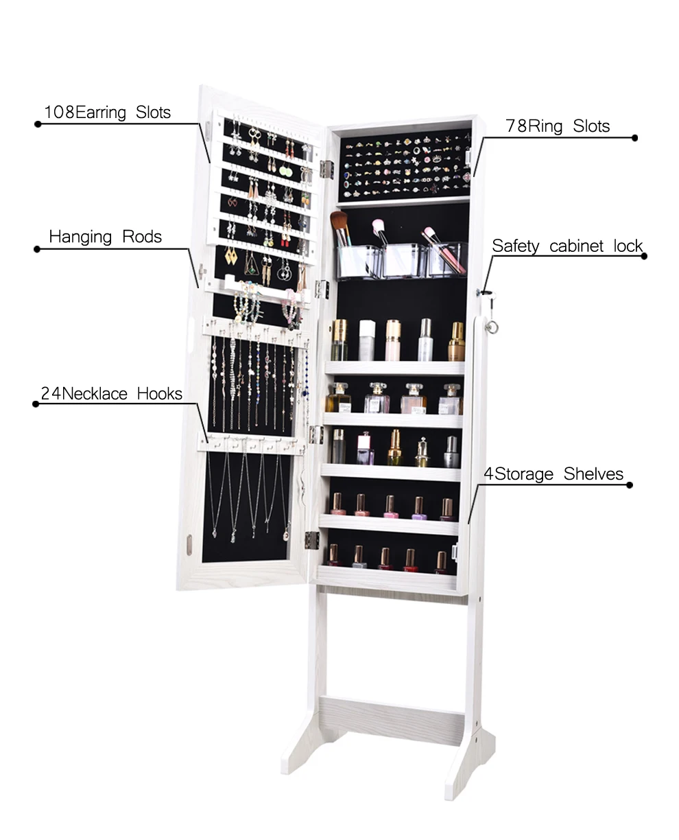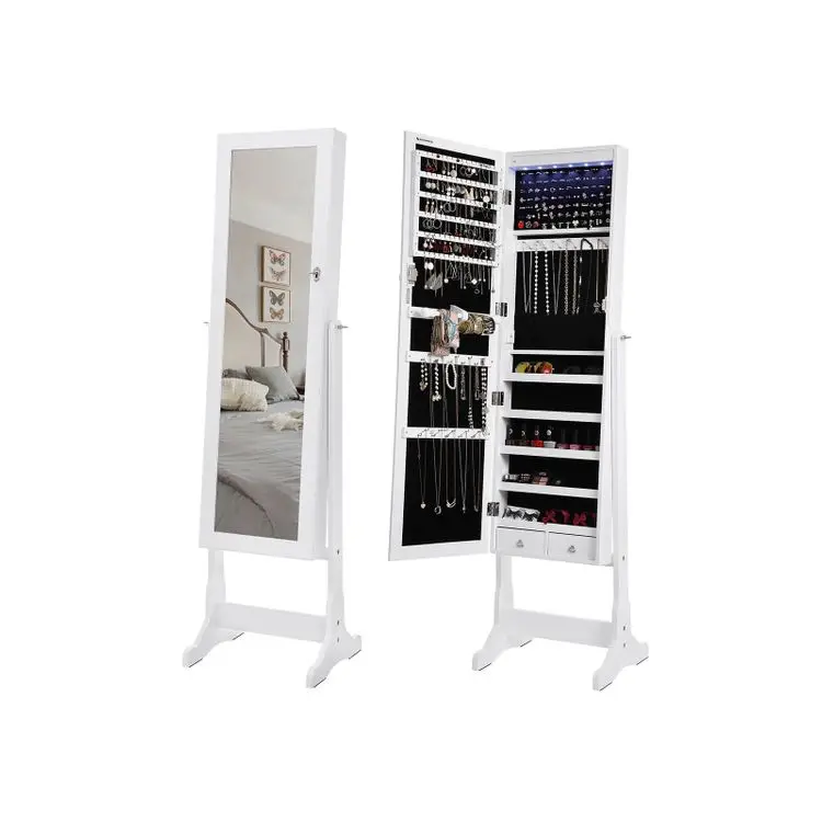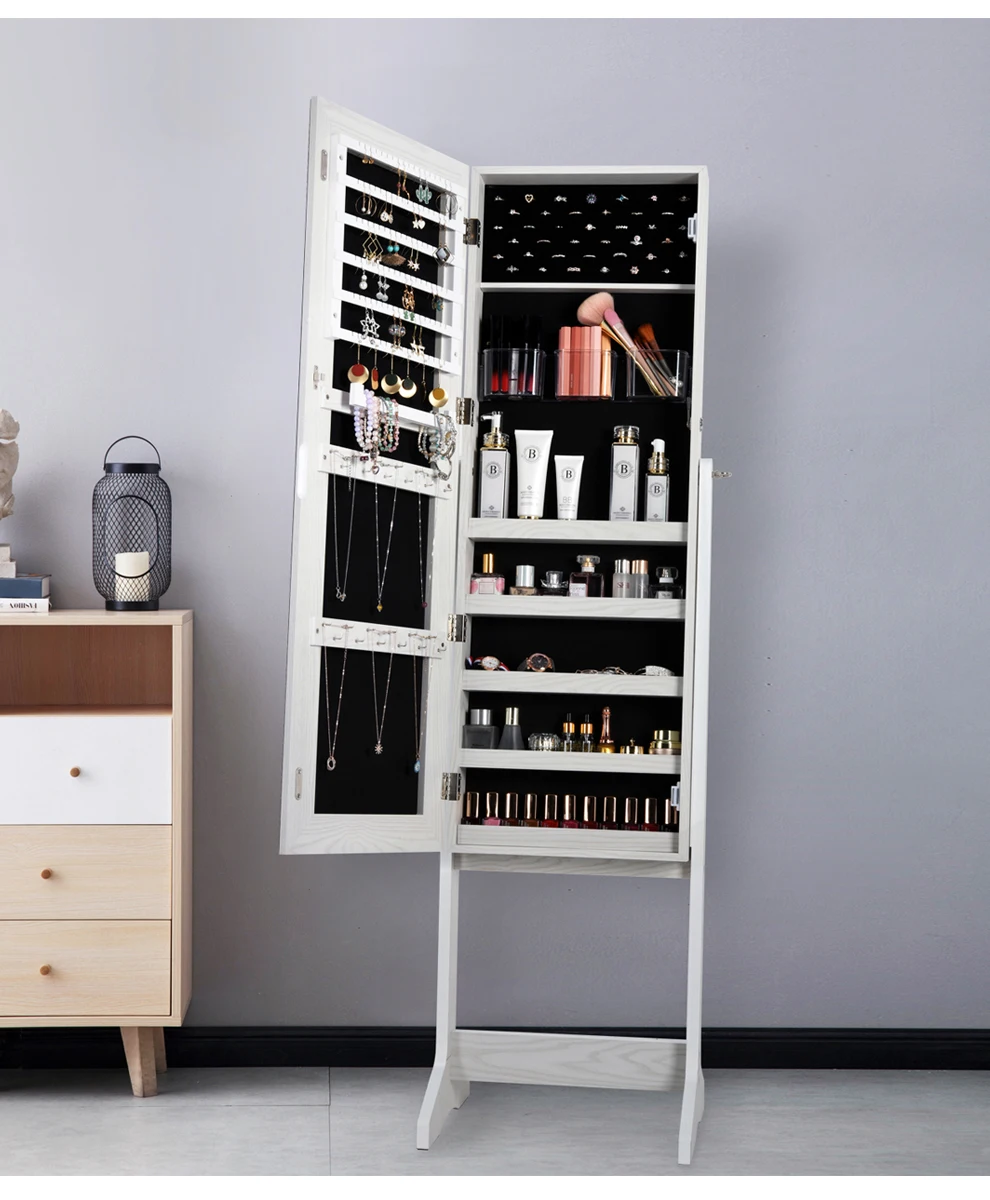 Этот ювелирный шкаф с зеркалом является идеальным местом для хранения всех ваших ювелирных изделий и аксессуаров для красоты. Очень элегантный с его цветом, гардероб будет идеальным в вашей спальне, гардеробной или прихожей. У него есть крючки и маленькие полки, чтобы разместить всю вашу коллекцию ювелирных изделий, очков, шарфов и т. д. больше никаких проблем с хранением ваших косметических аксессуаров!