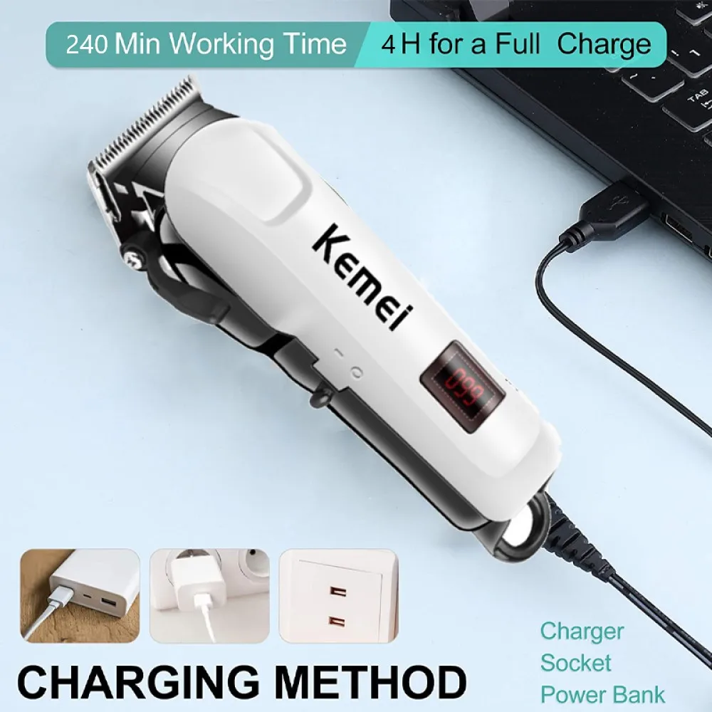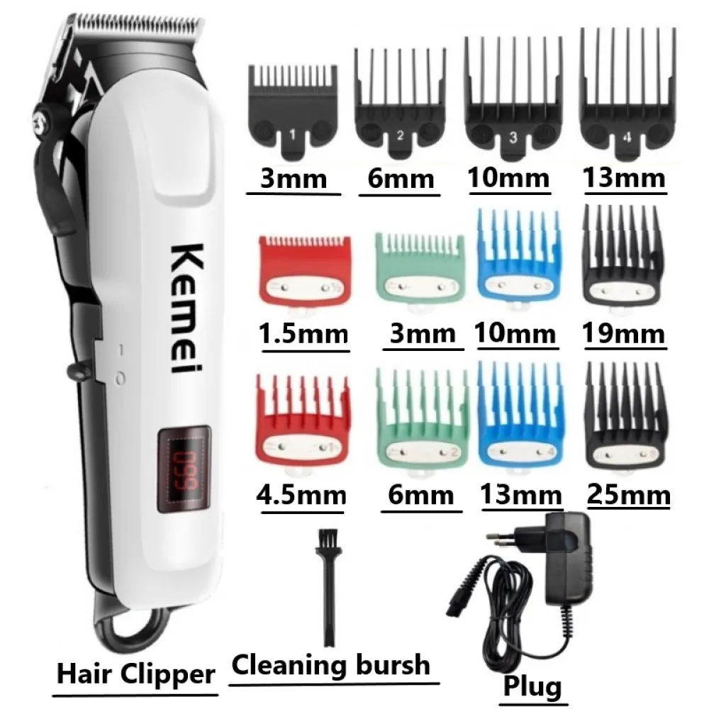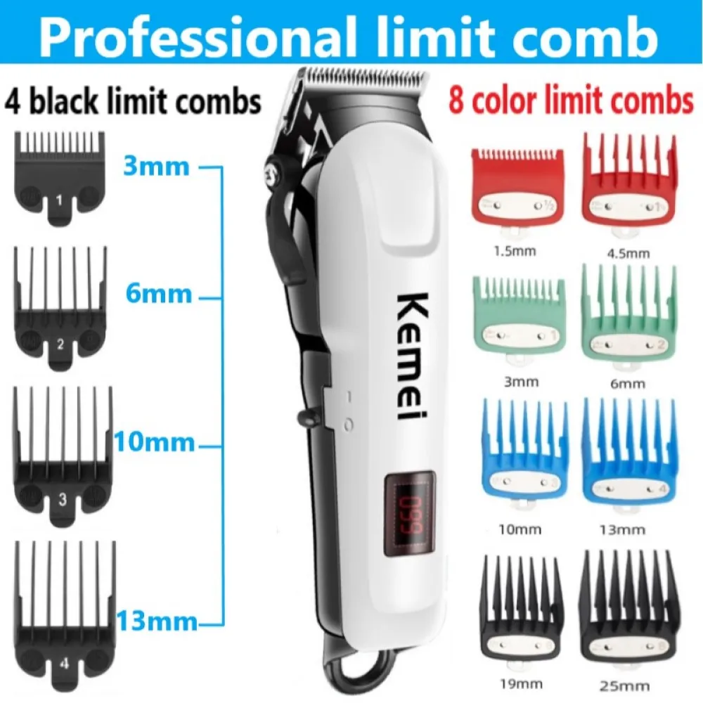 1. Лезвие можно отрегулировать2. Зарядка ЖК-цифровой напоминание; Рабочее ЖК-цифровое напоминание3. Лезвие из нержавеющей стали, лезвие шириной 45 мм4. Шнур/Беспроводное использование5. Подходит для всех типов волос6. Подходит для мужчин/женщин/малышей/детей/пожилых людей/парикмахеров