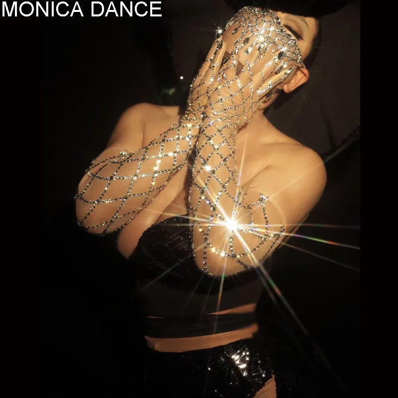 Женские сексуальные сценические Стрейчевые блестящие длинные перчатки с сеткой и кристаллами, аксессуары для танцев, певиц, ночных клубов, танцев, сценических выступлений