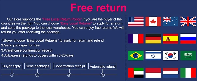 В нашем магазине есть услуга «бесплатный возврат», которая является бесплатным возвратом для США, Канады, Австралии, Великобритании, Франции, Испании, Германии, России, Бразилии, Израиля, Южной Кореи, саудовская Аравия, ОАЭ, Польша, Нидерланды, Италия