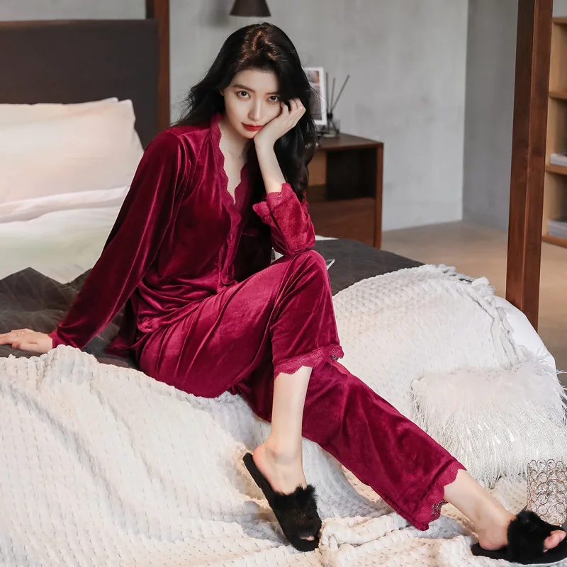Золотистый бархатный пижамный комплект, женские осенне-зимние костюмы с длинными рукавами и брюками, кружевной кардиган, домашняя одежда, Велюровый костюм для женщин